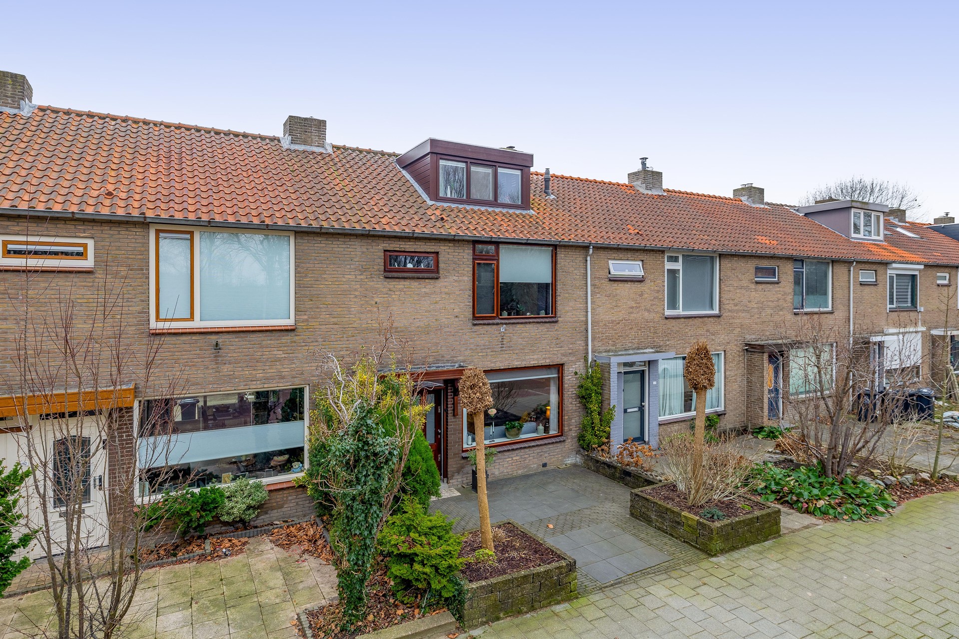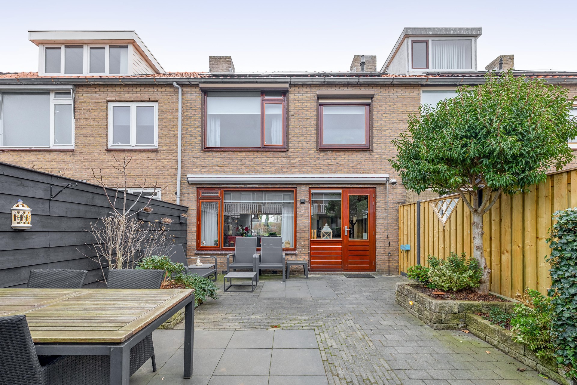 De verzorgde voortuin is voorzien van een moderne tegel en twee bomen. Boven de voordeur hangt een luifel.