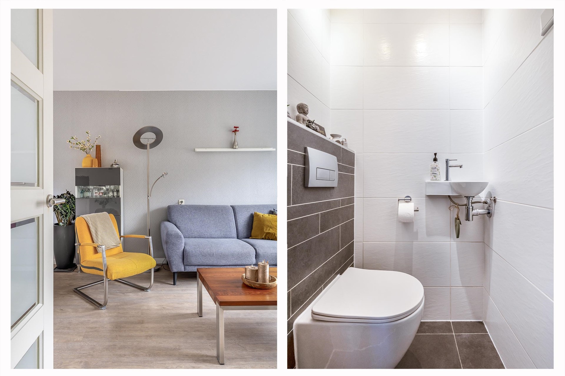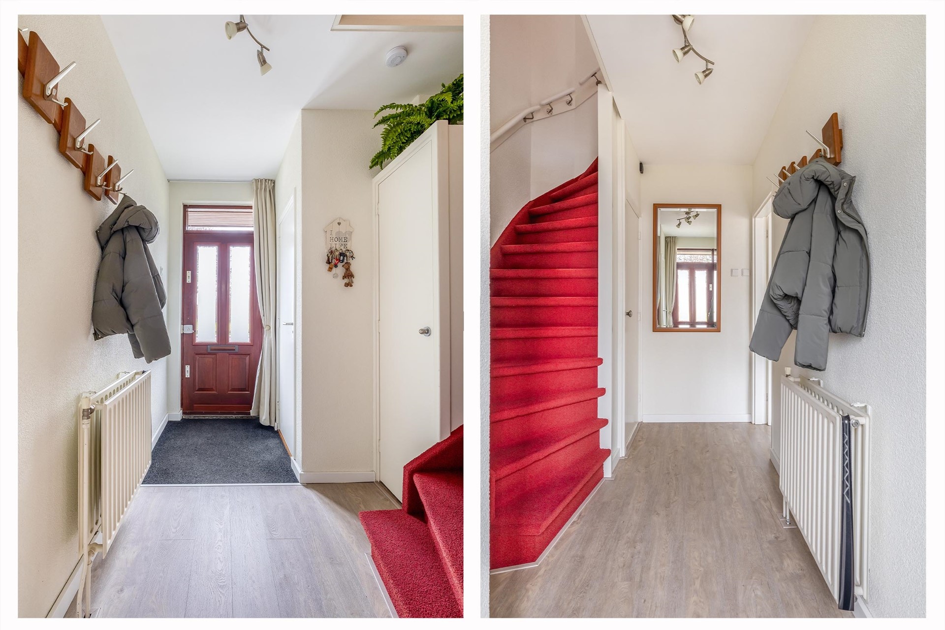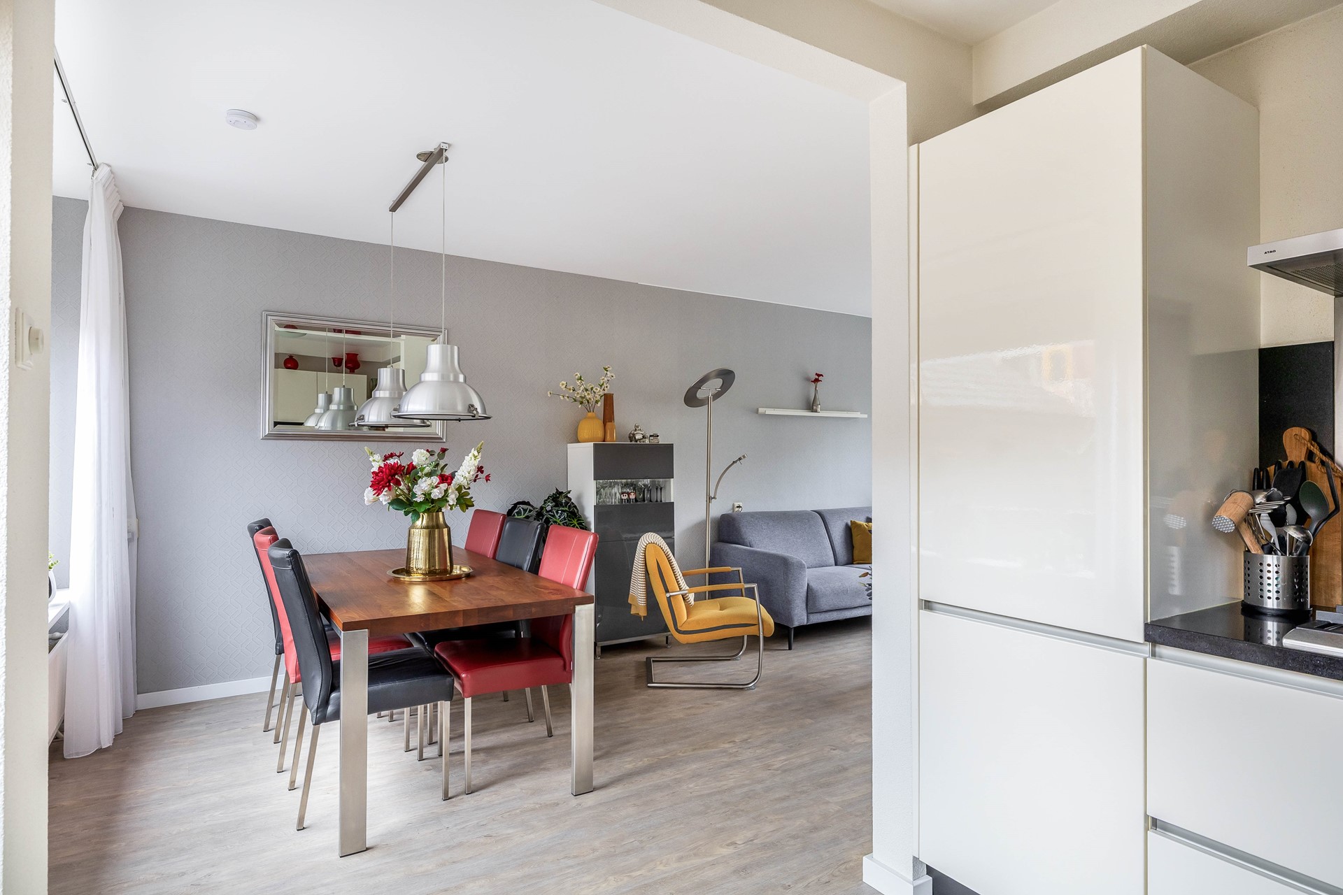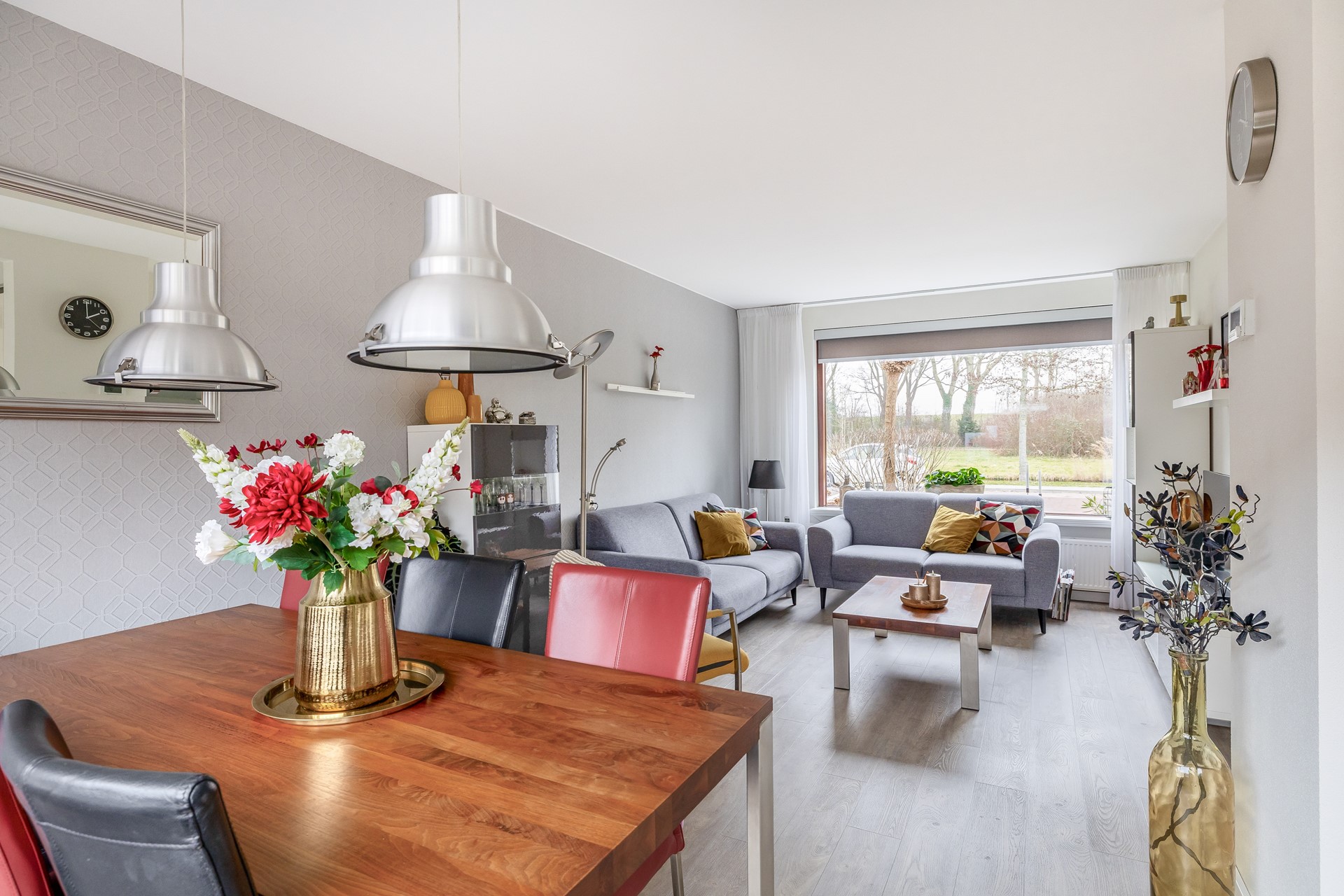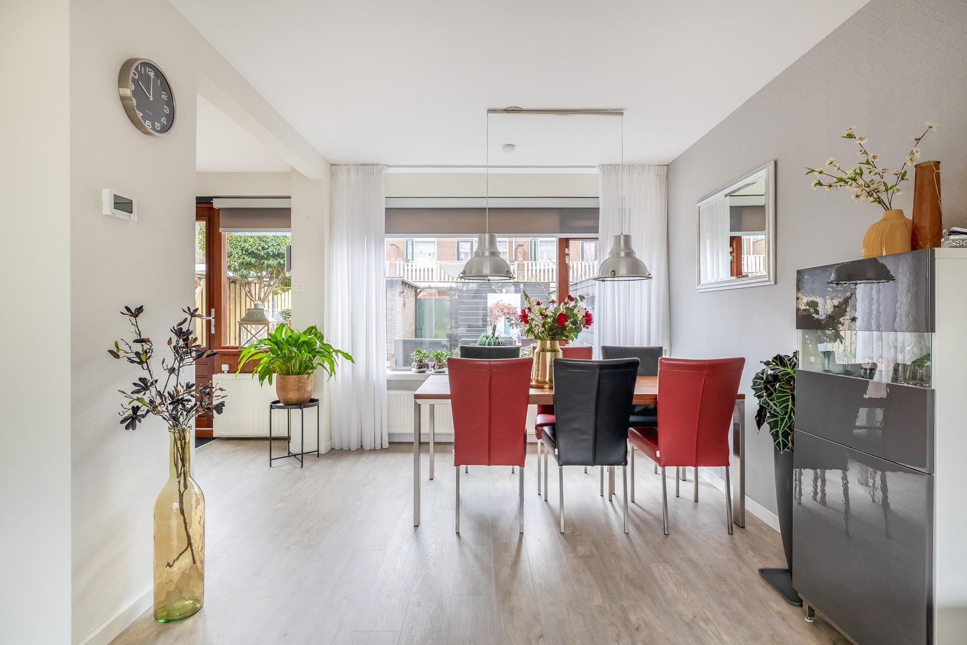 Entree, hal voorzien van een moderne meterkast, trapkast, trapopgang naar de 1e verdieping en het toilet. Het toilet is volledig betegeld en afgewerkt met een antraciete vloertegel en antraciet-witte wandtegels en is voorzien van een fonteintje. Vanuit de hal stappen we de fijne, lichte woonkamer binnen. Over de gehele begane grond ligt een nette laminaatvloer (geplaatst in 2022) in een mooie vergrijsde houtlook. Aan de voorzijde is er een groen uitzicht over de singel en het park. Het eetgedeelte biedt leuk zicht op de tuin en staat in open verbinding met de keuken.