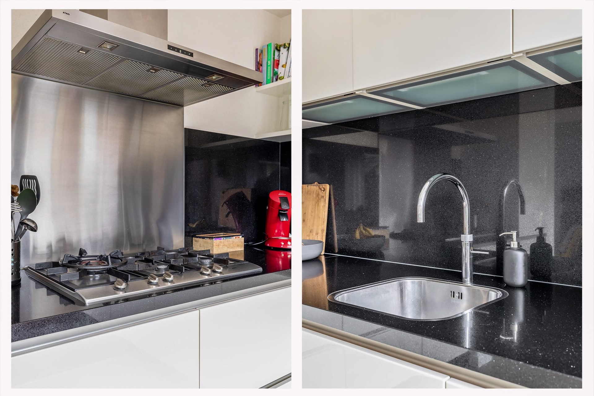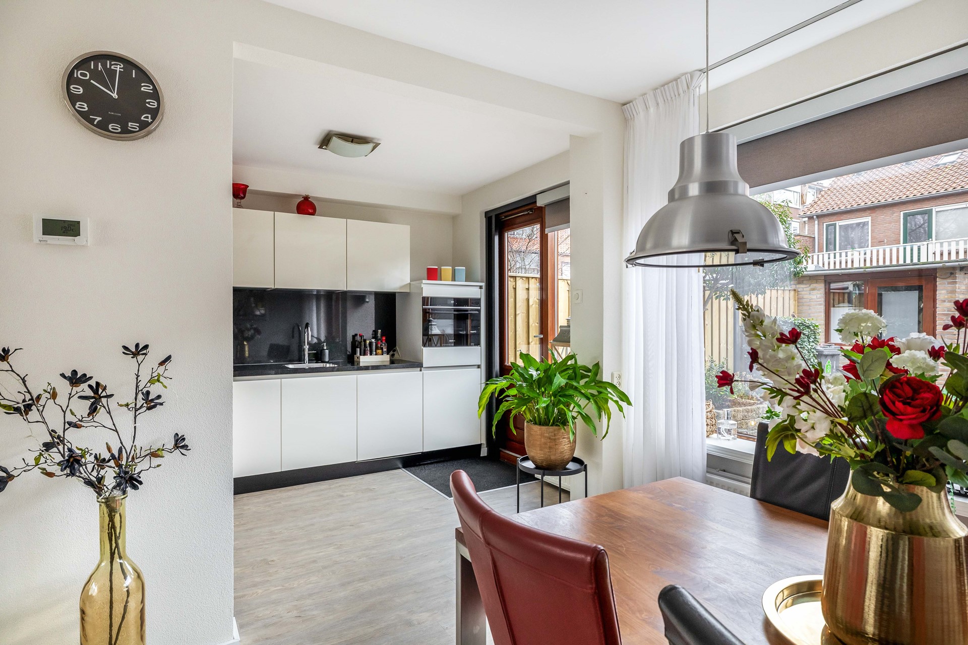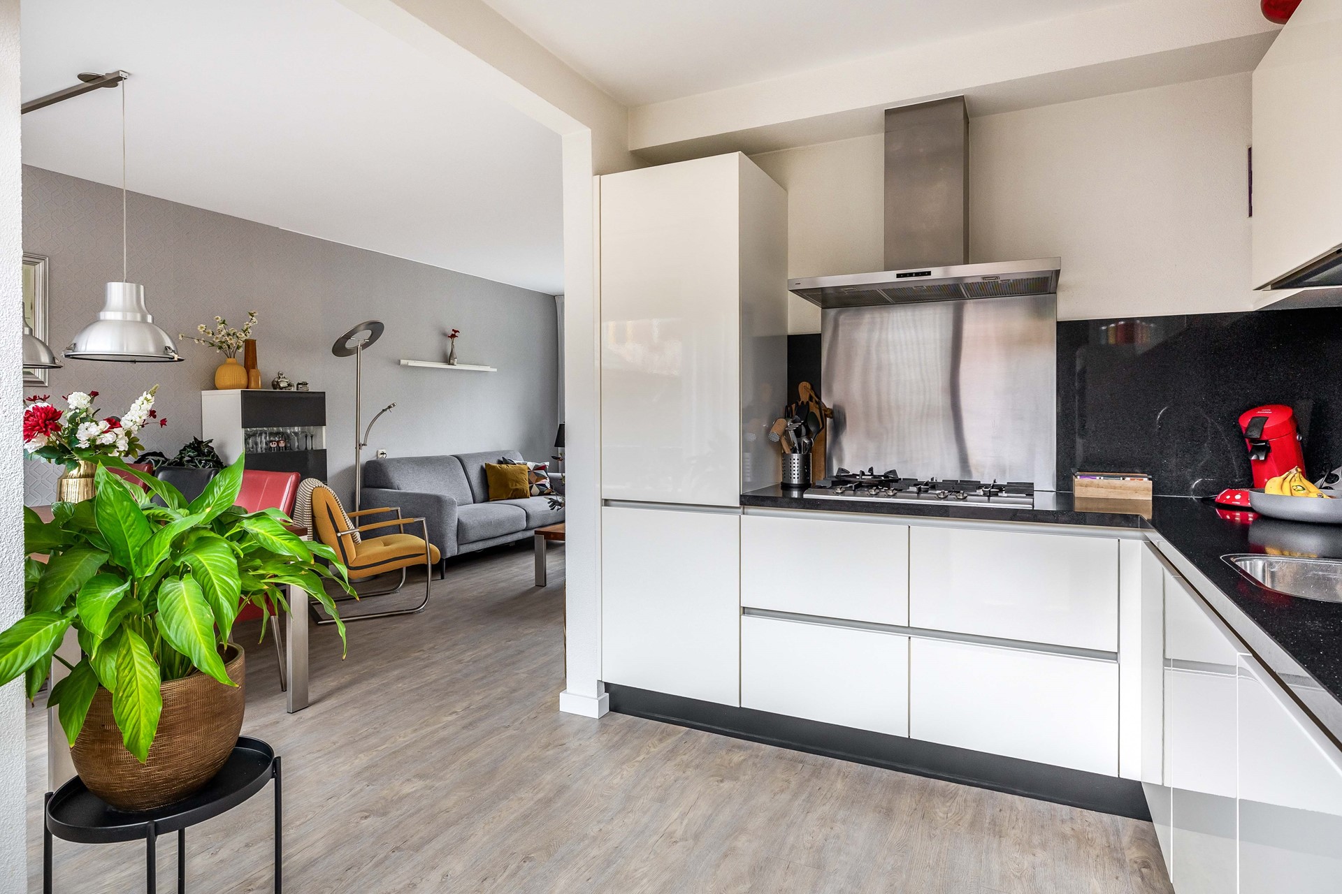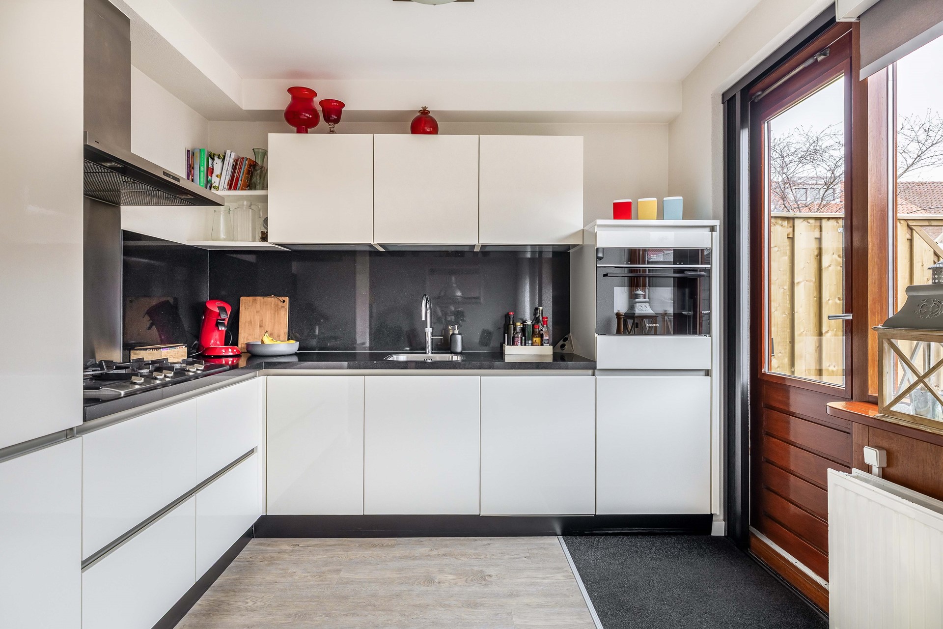 De keuken is uitgevoerd met witte hoogglans kastjes en een zwart natuurstenen aanrechtblad met bijpassende achterwand. Hier vinden we diverse inbouwapparatuur terug, waaronder een Quooker-kraan, koelkast, vriezer, vaatwasser, combi-oven/combimagnetron en een 5-pits gaskookstel met daarboven een afzuigkap. Vanuit de keuken is er toegang tot de achtertuin.