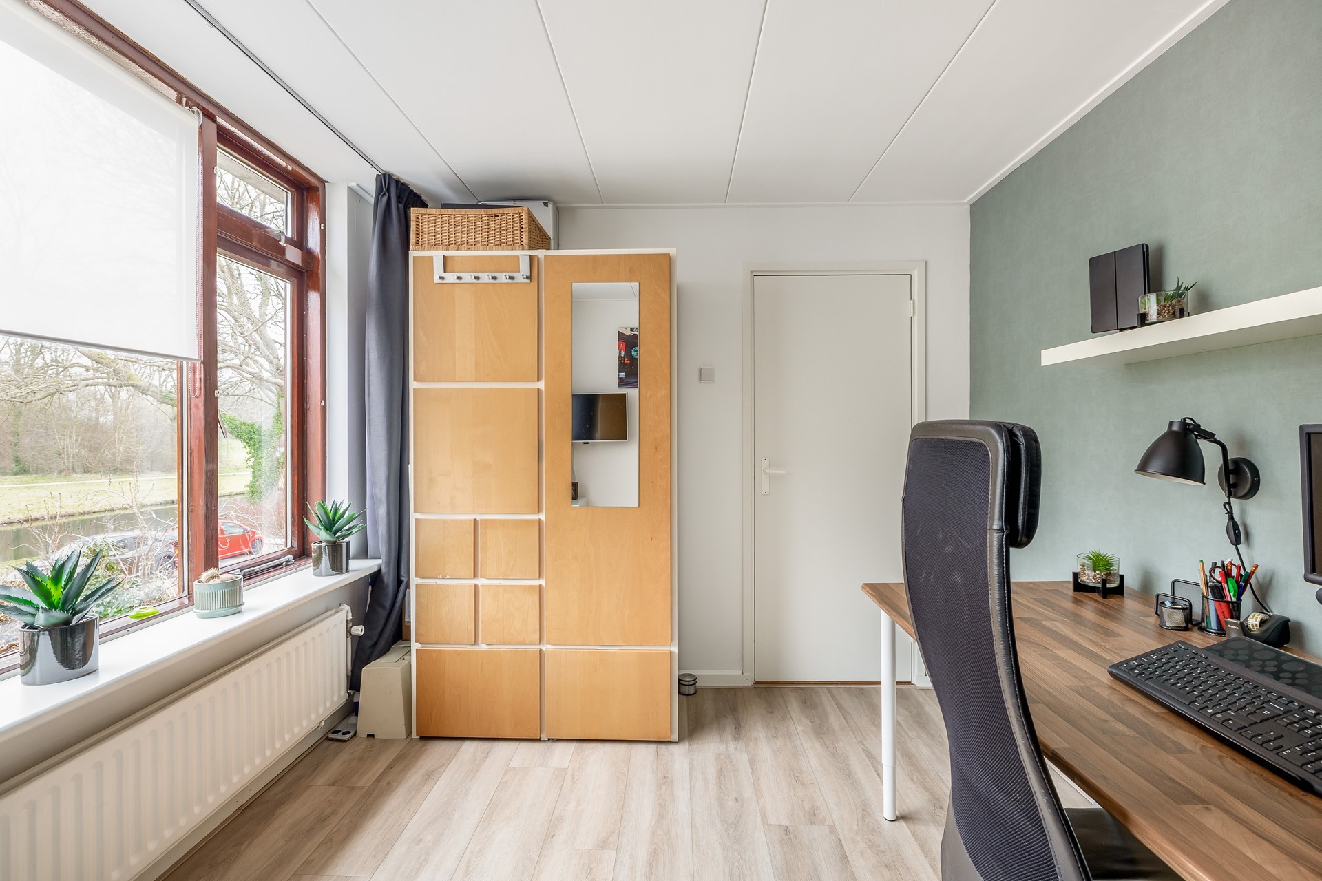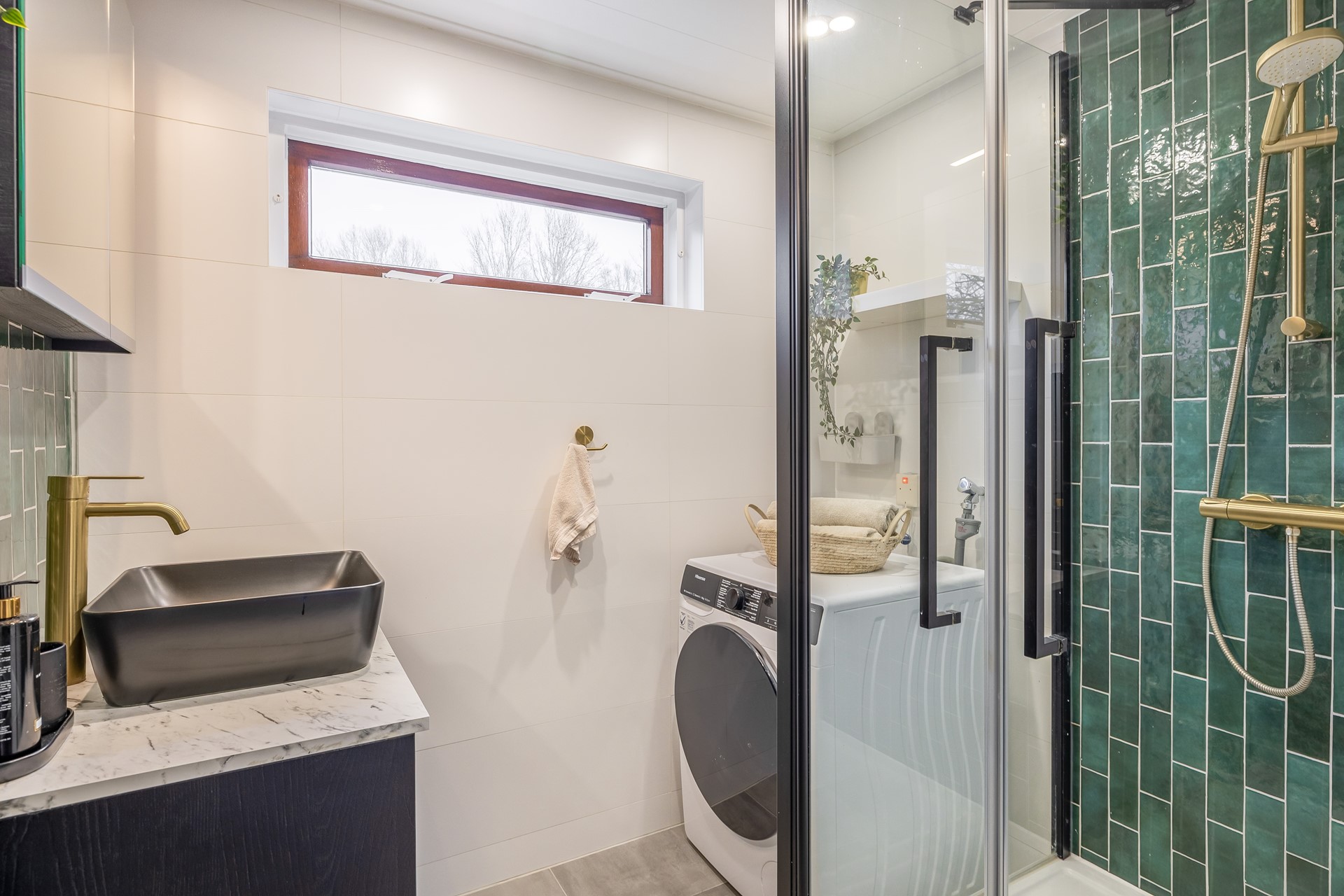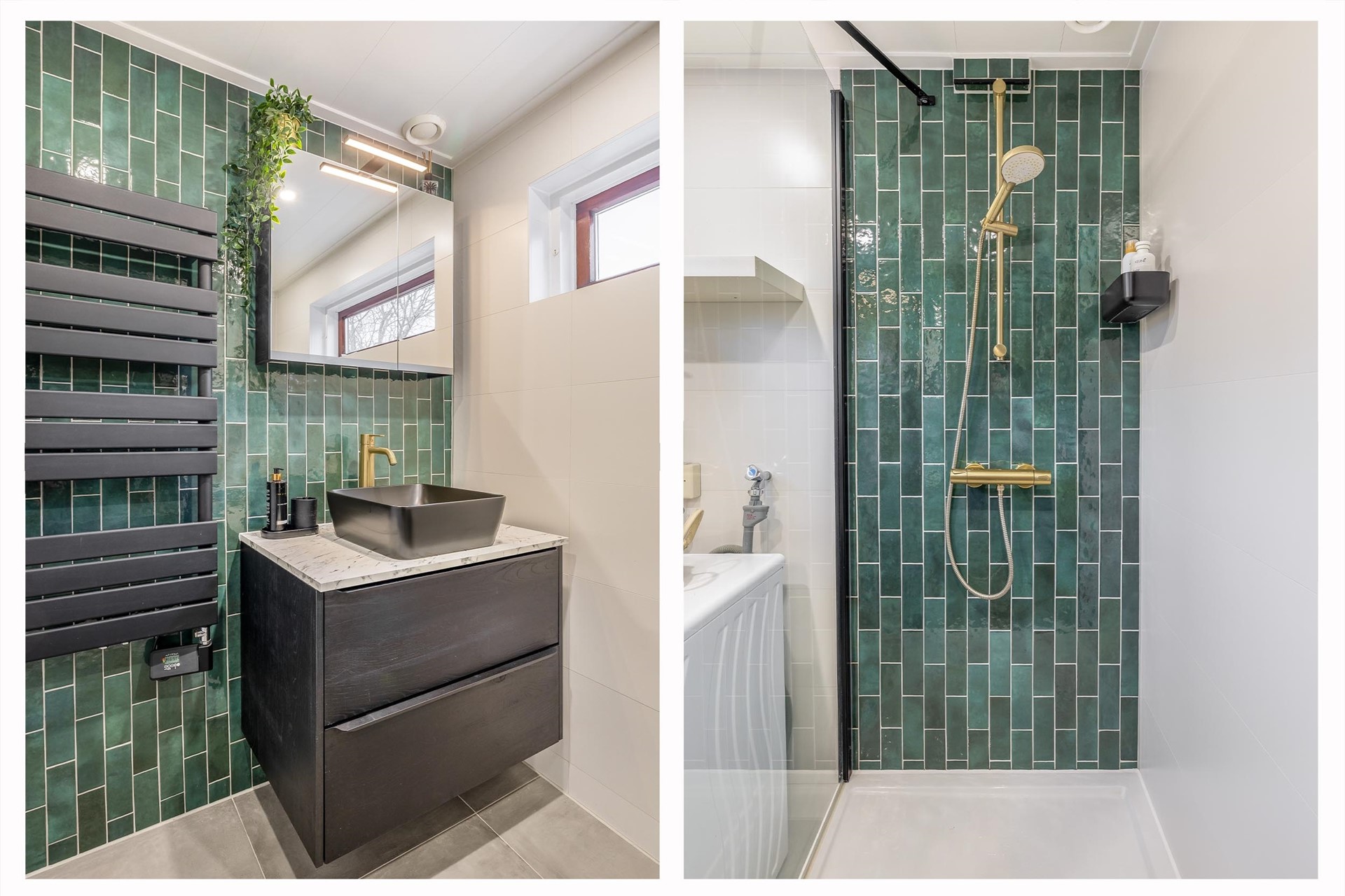 We komen aan bij de moderne badkamer uit 2023. Op de vloer ligt een grijze betonlook tegel en de achterwand van de inloopdouche is afgewerkt met een prachtige groene tegel: een echte eyecatcher en helemaal van nu! De zwarte inloopdouche beschikt over een glazen deur en een goudkleurige douchekop. Het wastafelmeubel is zwart en afgewerkt met een marmerlook blad en een zwarte waskom met een goudkleurige kraan. Daarnaast hangt hier een zwarte designradiator. Erg praktisch is het raam in de badkamer, ideaal voor natuurlijke ventilatie. Verder is hier de aansluiting voor de wasmachine aanwezig.