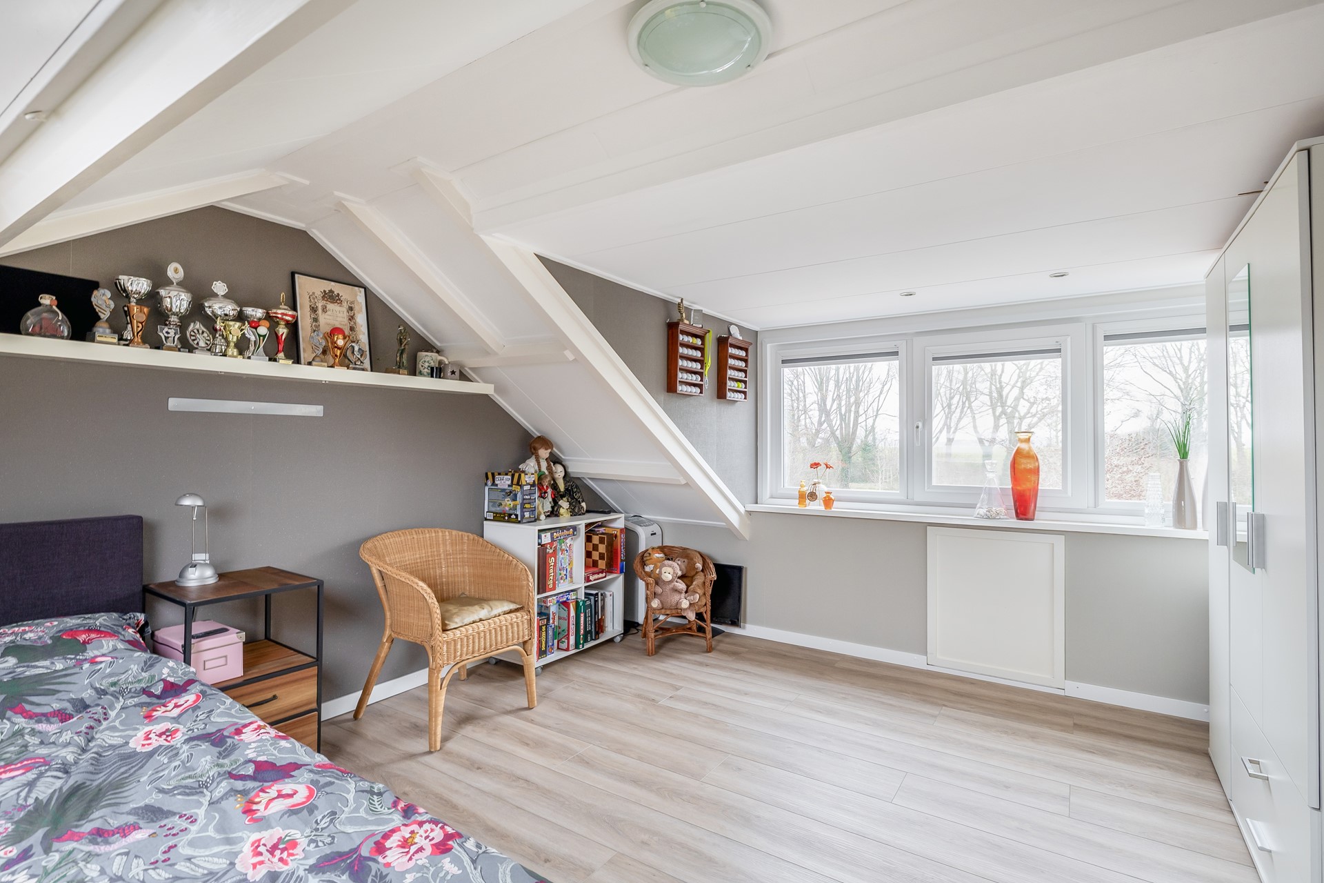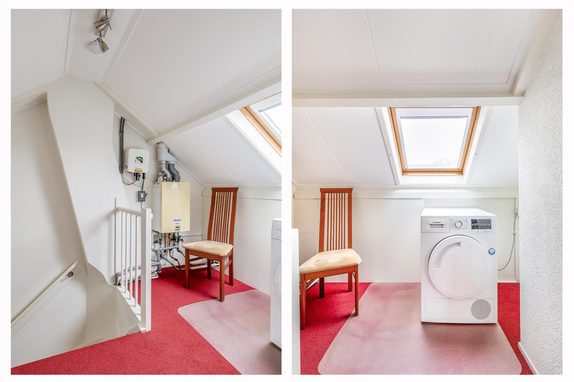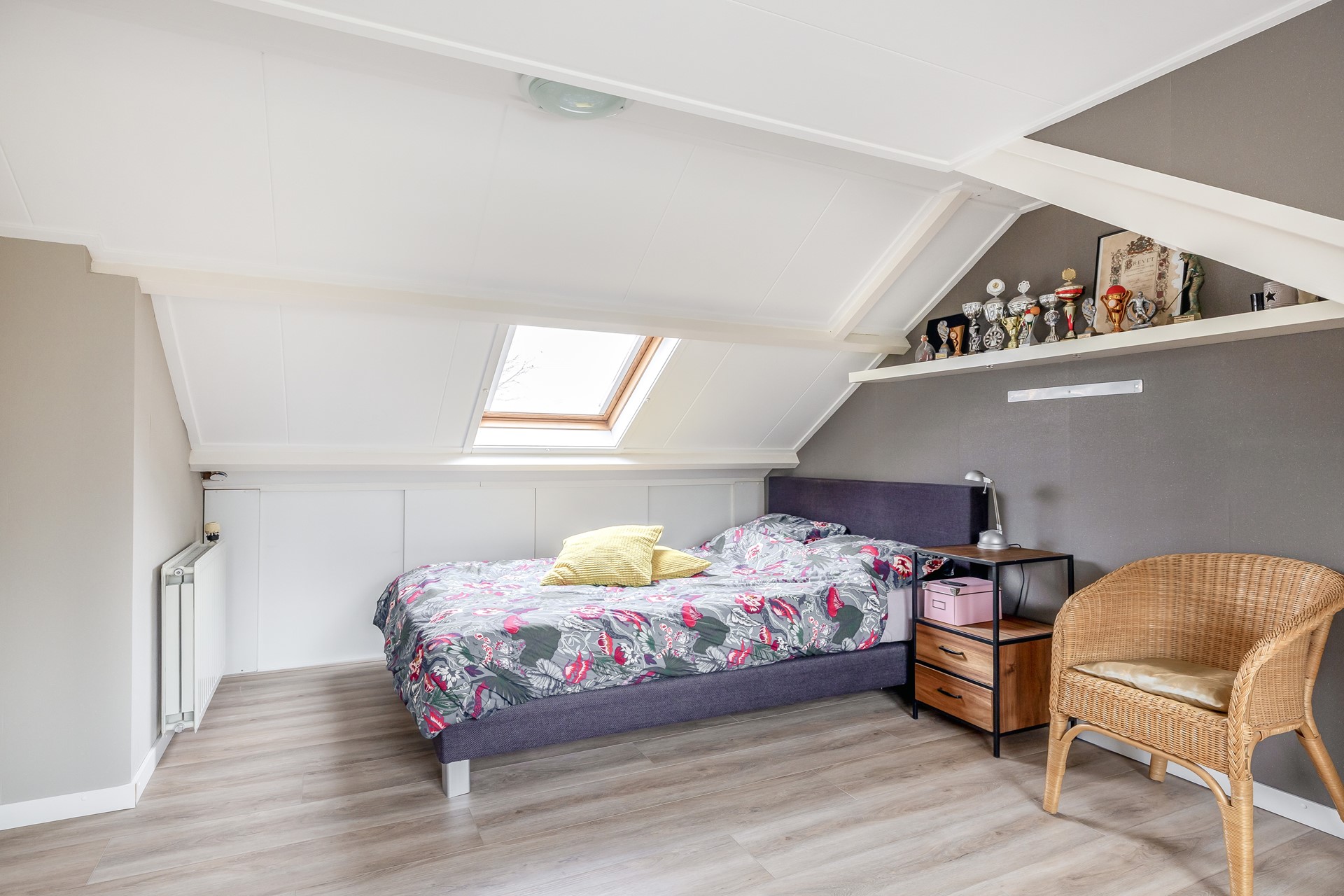 Middels een vaste trap bereiken we de 2e verdieping, waar de ruimte is opgedeeld in twee delen. Op de voorzolder bevinden zich de aansluiting voor de droger, de omvormer voor de zonnepanelen en de cv-ketel (Remeha, 2009). Het tweede gedeelte van deze verdieping biedt een heerlijke vierde slaapkamer. Hier is een dakkapel geplaatst, voorzien van kunststof kozijnen. Het dak is goed geïsoleerd, wat zorgt voor een aangename leefruimte. Op de vloer ligt een mooie laminaatvloer uit 2023 en op het dak liggen 7 zonnepanelen.