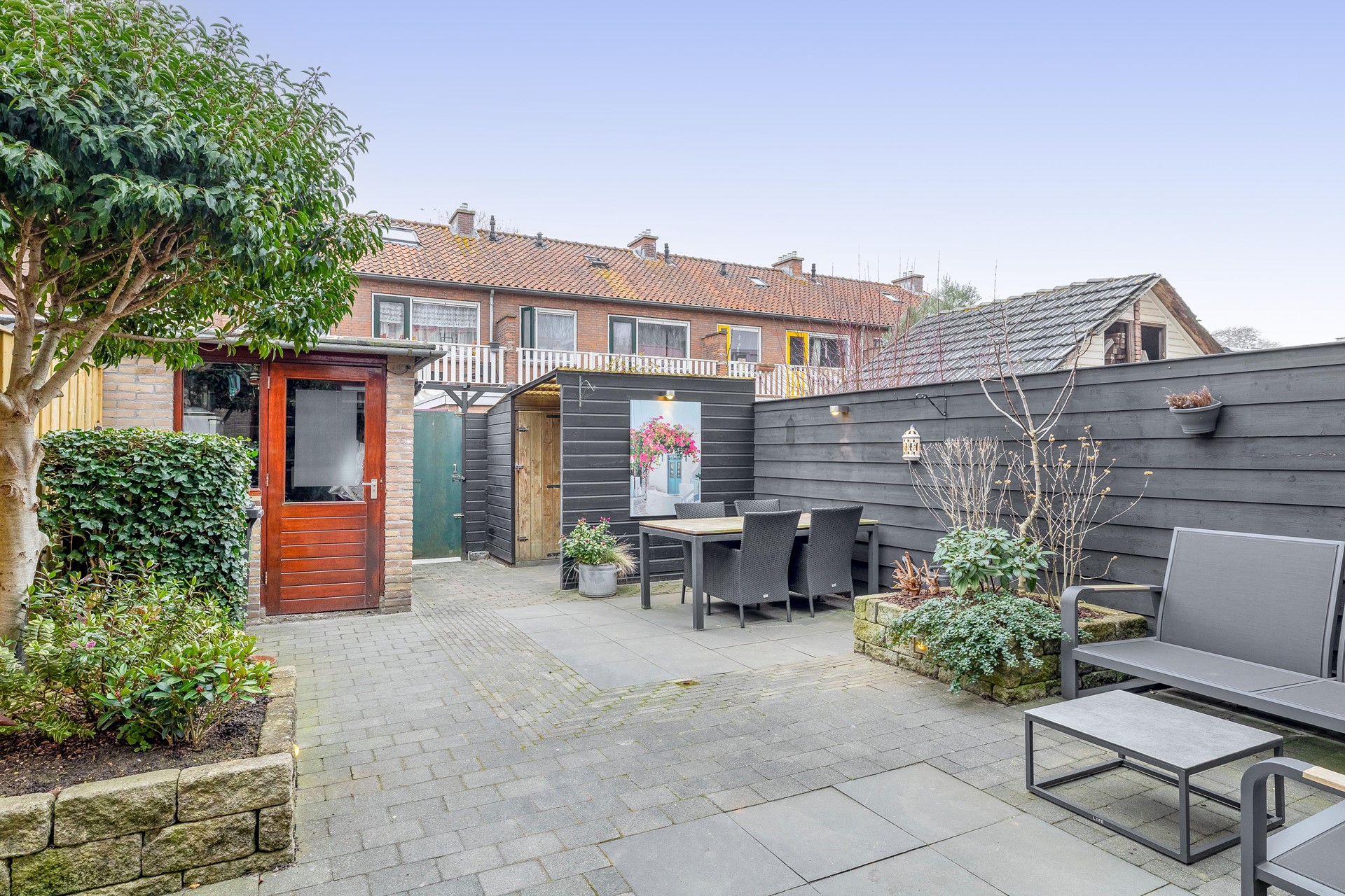 De achtertuin heeft een moderne uitstraling dankzij de antraciete tegels en zwarte schuttingen aan één zijde. De andere zijde is voorzien van een mooie houten schutting met donkere betonpalen, wat zorgt voor een mooi geheel. De borders zijn gevuld met vaste struiken en een boom. Aan de gevel hangt een zonnescherm over de gehele breedte van de woning. Achterin de tuin bevinden zich een stenen berging (voorzien van elektra), een tweede houten berging met een stukje overkapping en een achterom.