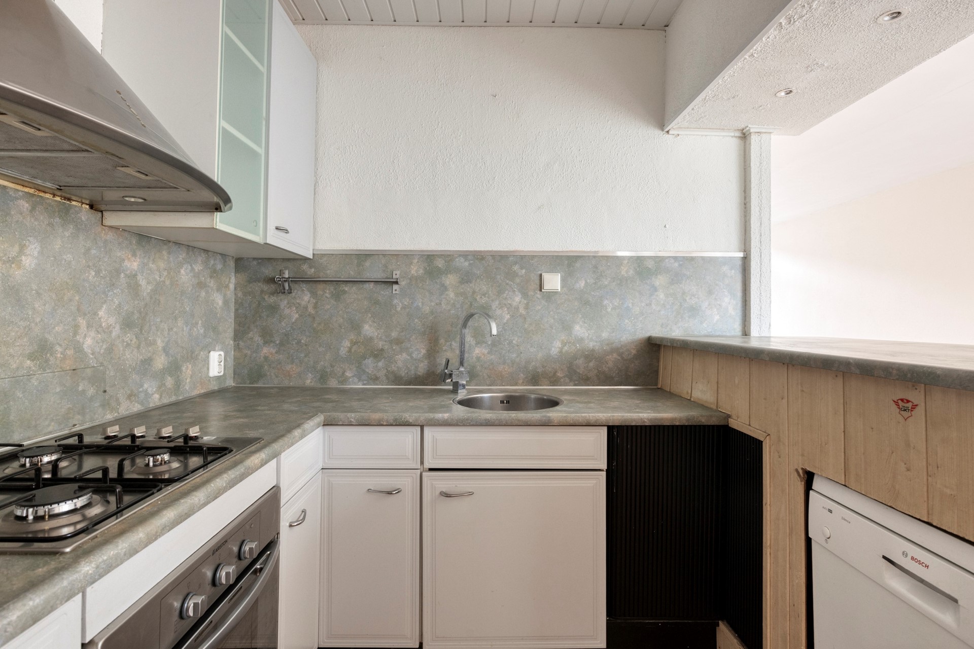 We lopen door naar de lichte woonkamer met links de open keuken en bijkeuken, en rechts het eetgedeelte met een groot raam dat uitzicht biedt op de speeltuin aan de voorzijde – ideaal voor gezinnen met kinderen.