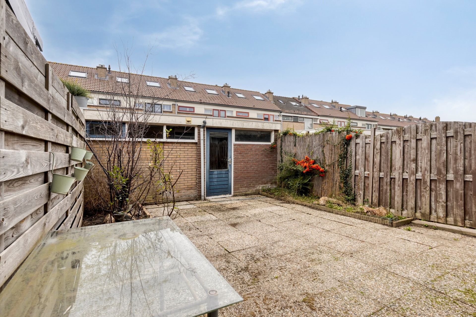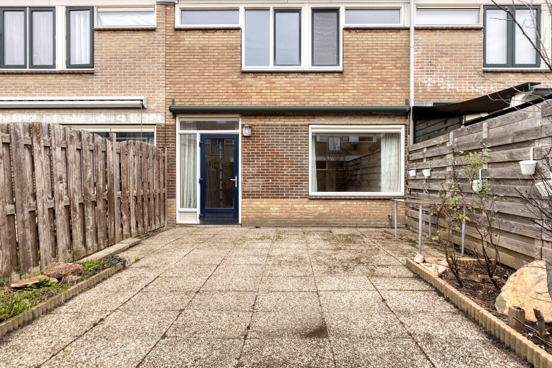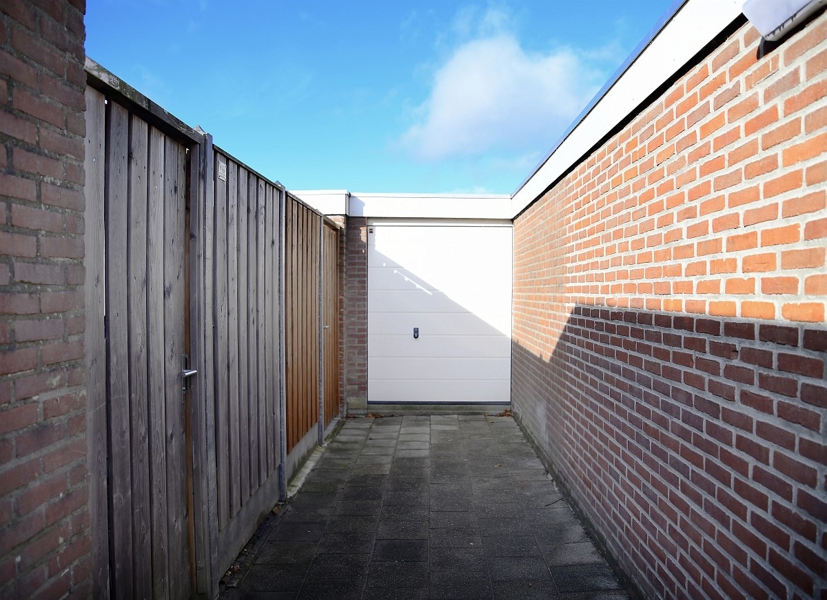 Via de woonkamer stap je de achtertuin in. Deze is volledig bestraat, voorzien van schuttingen, een zonnescherm en heeft een gunstige ligging op het zuiden. De berging is extra groot en voorzien van een garagedeur met toegang tot de achtergelegen steeg – ideaal voor bijvoorbeeld het stallen van een motor of fietsen.