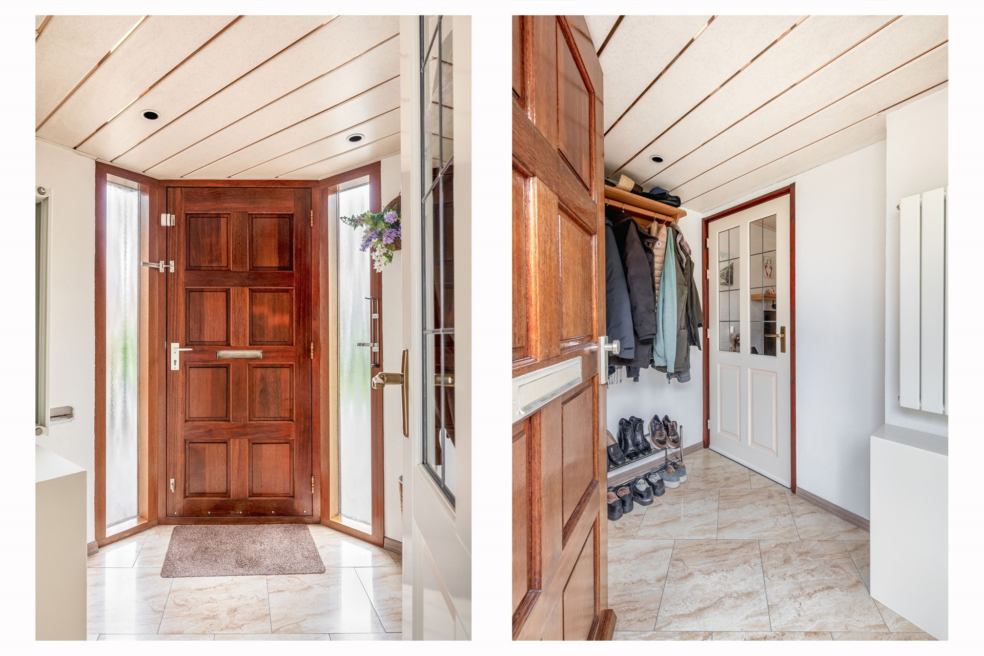 We komen binnen in de vergrote en geïsoleerde entree, waar ruimte is voor de garderobe en waar zich ook de meterkast bevindt.