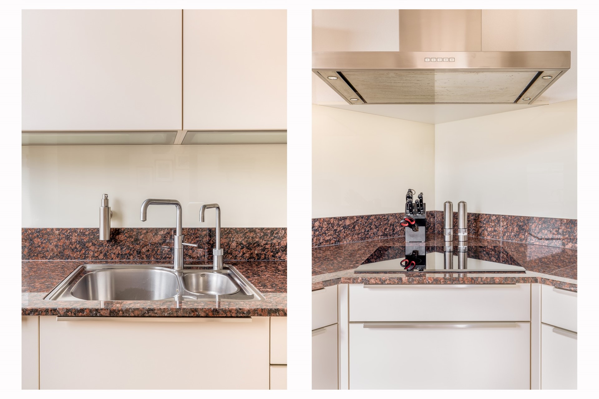 Naast de eethoek kijken we aan de rechterkant de keuken in. Deze is opgesteld in een L-vorm. In de keuken vinden we de volgende apparatuur: een inductiekookplaat (uit 2024) met een RVS-afzuigkap erboven, anderhalve spoelbak, een dubbele kraan waarvan één een Quooker-kraan is, een combimagnetron, een koelkast en vriezer.