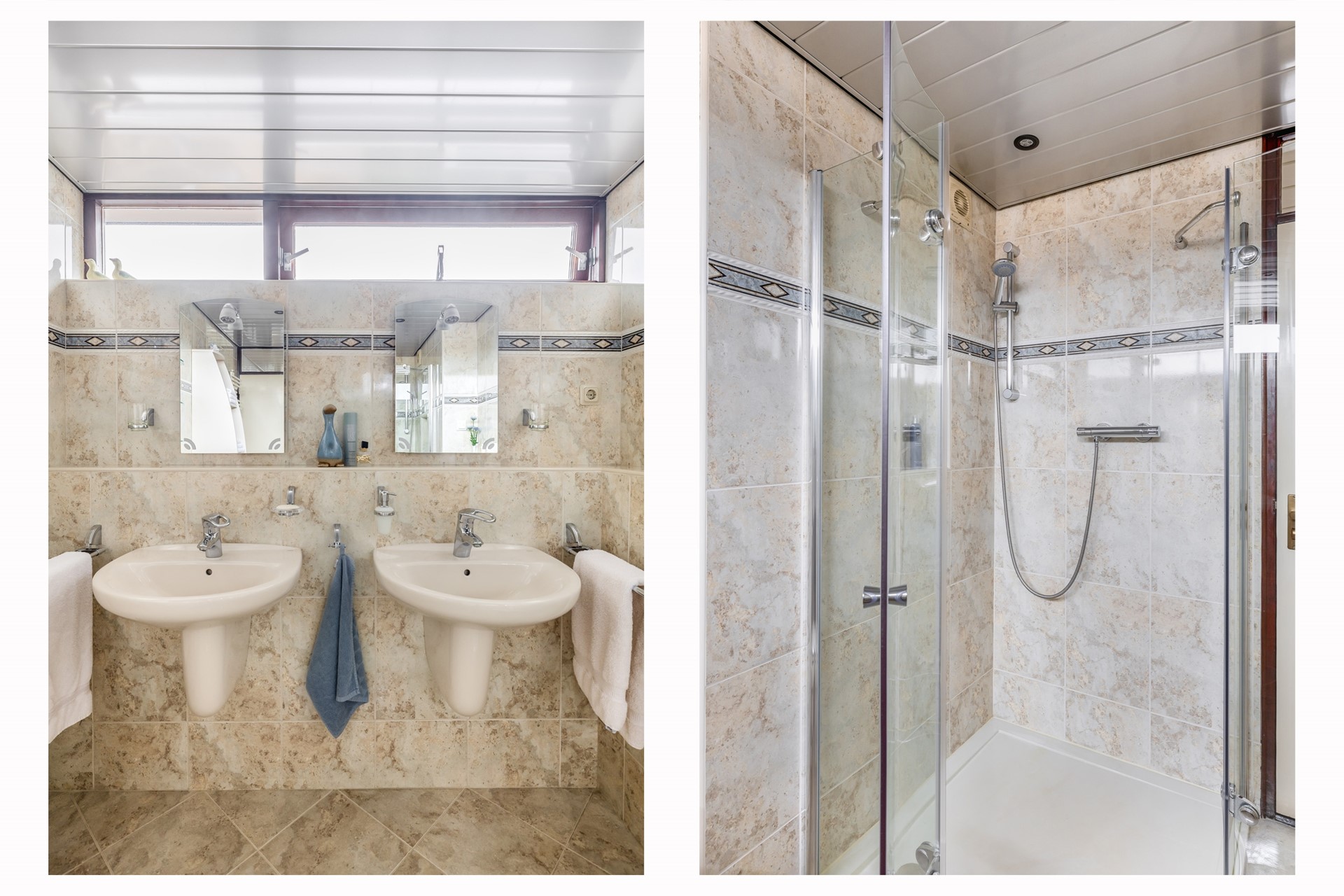 We gaan verder naar de grote badkamer. Hier bevinden zich een douchecabine, 2 wastafels met spiegels erboven, een 2e toilet en een wastafelmeubel. Ook is er een raam, wat zorgt voor natuurlijke lichtinval en ventilatie. Daarnaast is er elektrische vloerverwarming en zijn in het plafond lichtspots verwerkt.