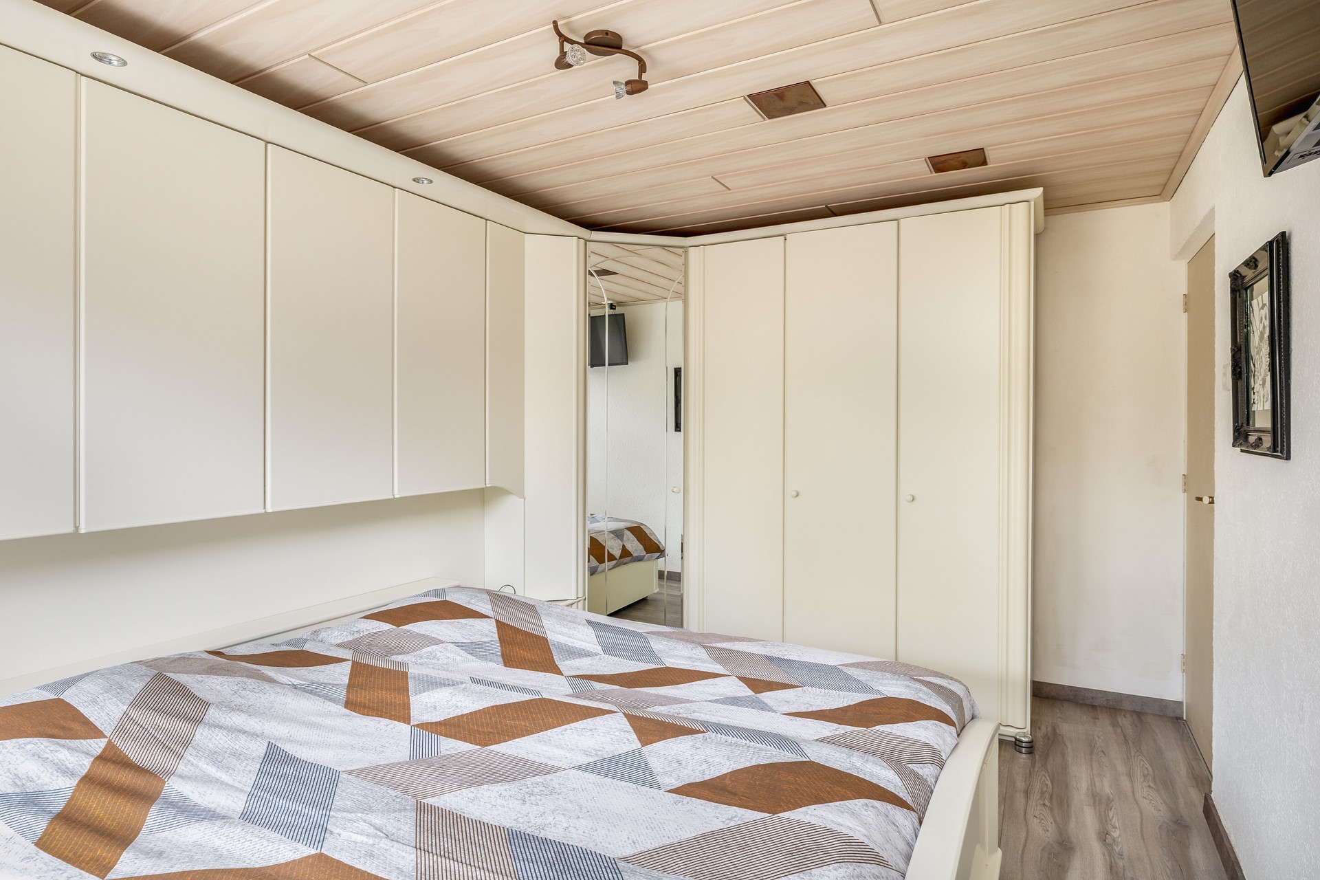 Middels een vaste trap bereiken we de 2e verdieping. De verdieping is opgedeeld in 2 ruimtes: een voorzolder en een slaapkamer. Op de voorzolder bevinden zich de aansluitingen voor de wasmachine en de droger. De 2e verdieping heeft maar liefst 2 dakkapellen aan beide kanten van de woning, deels op de voorzolder en deels in de slaapkamer. De slaapkamer is heerlijk ruim en biedt veel mogelijkheden. Deze ruimte zou zelfs in 2 slaapkamers opgesplitst kunnen worden. De warmtepomp (Panasonic 5 kilowatt, uit 2017) is bevestigd aan de schoorsteen buiten, bereikbaar vanuit een toegangsluik op de voorzolder.