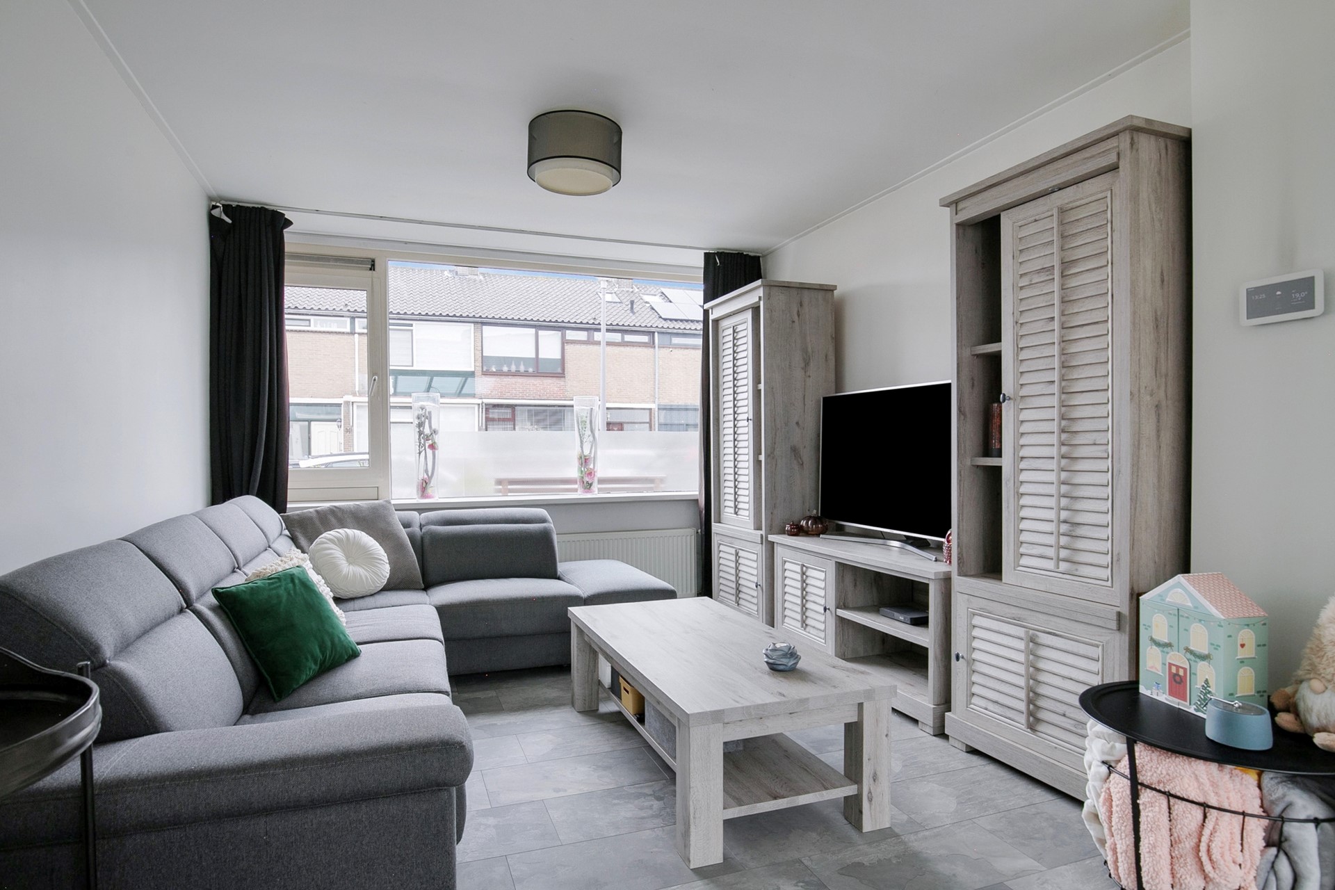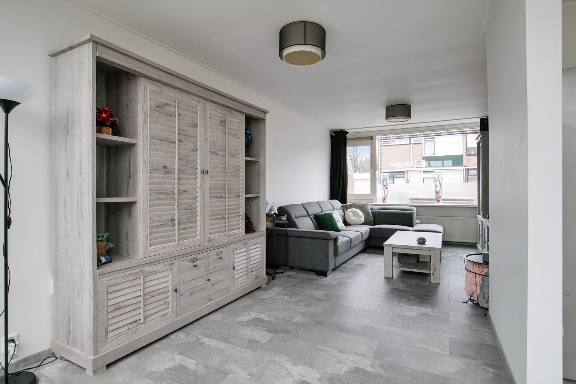 Entree, hal voorzien van meterkast, trapkast, de trapopgang naar de 1e verdieping en het toilet. Het toilet is half betegeld met een grijze tegel en een houtlook tegel en is voorzien van een hangend closet. Over de gehele begane grond ligt een laminaatvloer in grijze betonlook. De lichte doorzonwoonkamer met uitbouw beschikt over veel raampartijen en een schuifpui die toegang biedt tot de tuin. De open keuken heeft een rechte opstelling en is voorzien van een koel-vriescombinatie, vaatwasser, oven, magnetron en een gasfornuis met daarboven een afzuigkap. De rechte opstelling zorgt voor veel ruimte en een fijne, directe verbinding met de eethoek.