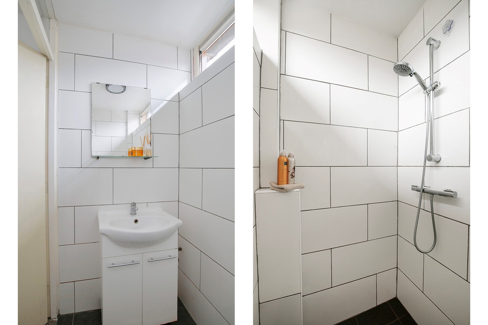 De badkamer is aan de wanden betegeld met witte tegels en op de vloer ligt een antracietkleurige tegel. De badkamer is voorzien van een inloopdouche en een wastafelmeubel met spiegel. Daarnaast is er een raam aanwezig, wat zorgt voor prettige natuurlijke ventilatie.