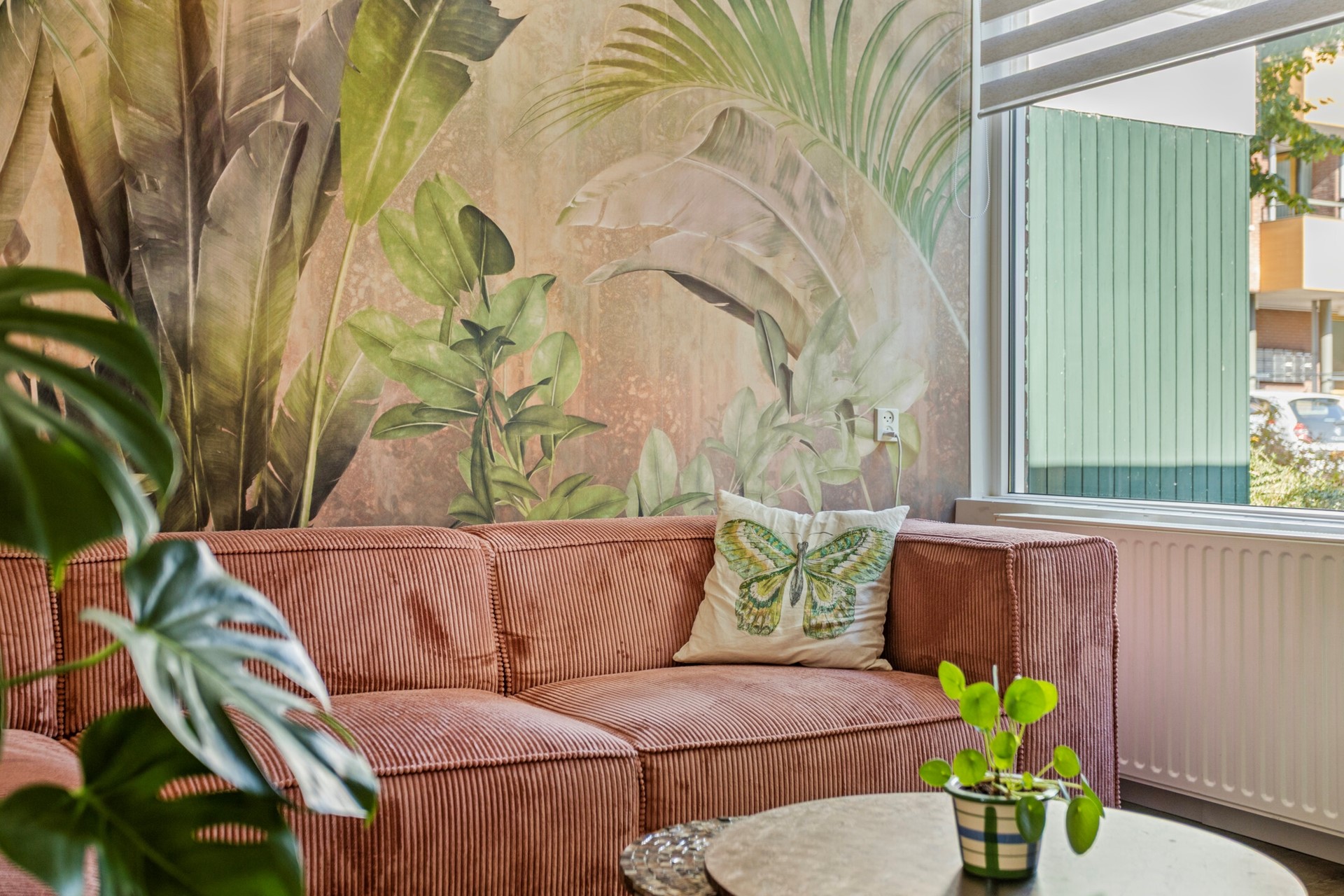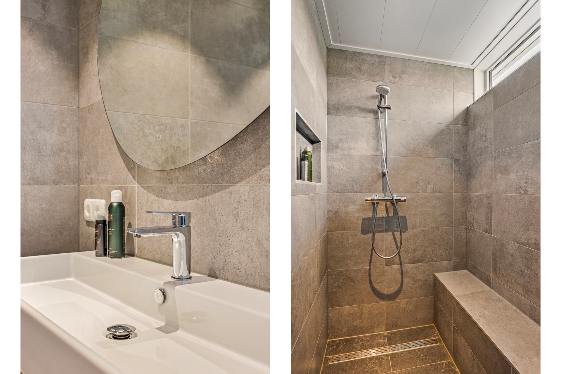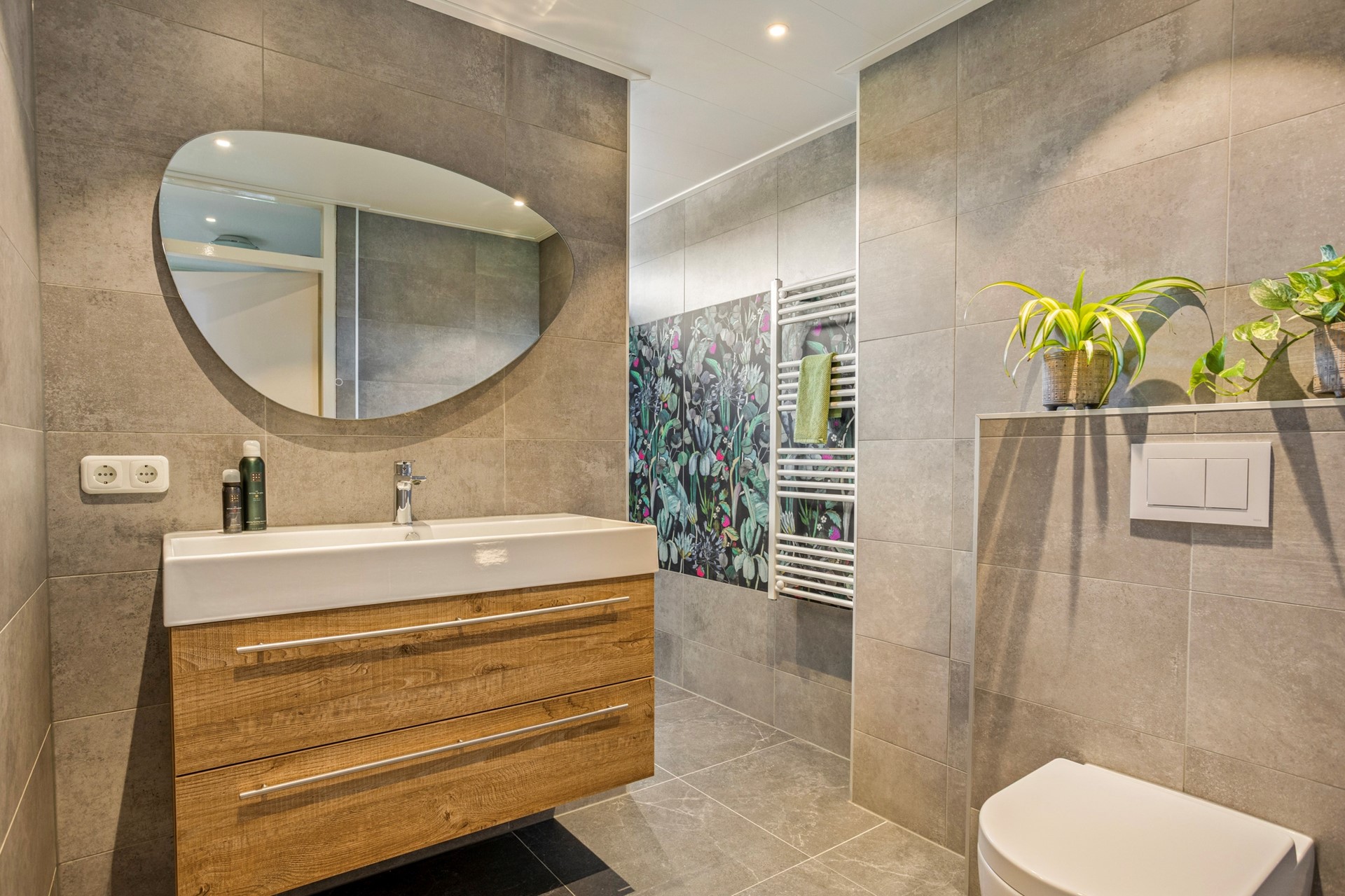 We gaan verder naar de grote, moderne badkamer. Deze is prachtig afgewerkt met een betonlook vloer en wandtegel. Eyecatcher van deze badkamer is de printtegel met bladeren en bloemen w zorgt voor een fijne sfeer. De inloopdouche heeft aan de ene zijde een nis en aan de andere zijde een zitbankje. Het wastafelmeubel is in houtlook, heeft 2 grote lades en er hangt een spiegel boven. Er is een 2e toilet, een handdoekenradiator en een raam aanwezig, fijn voor de natuurlijke lichtinval en ventilatie. In het plafond zijn lichtspots verwerkt.