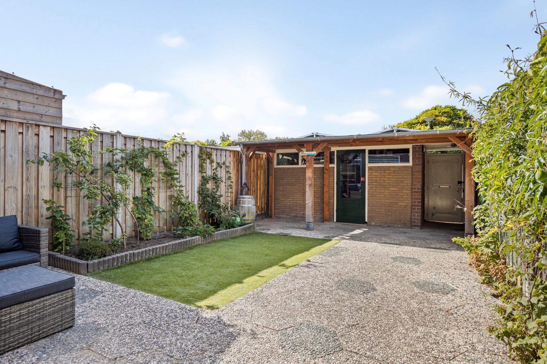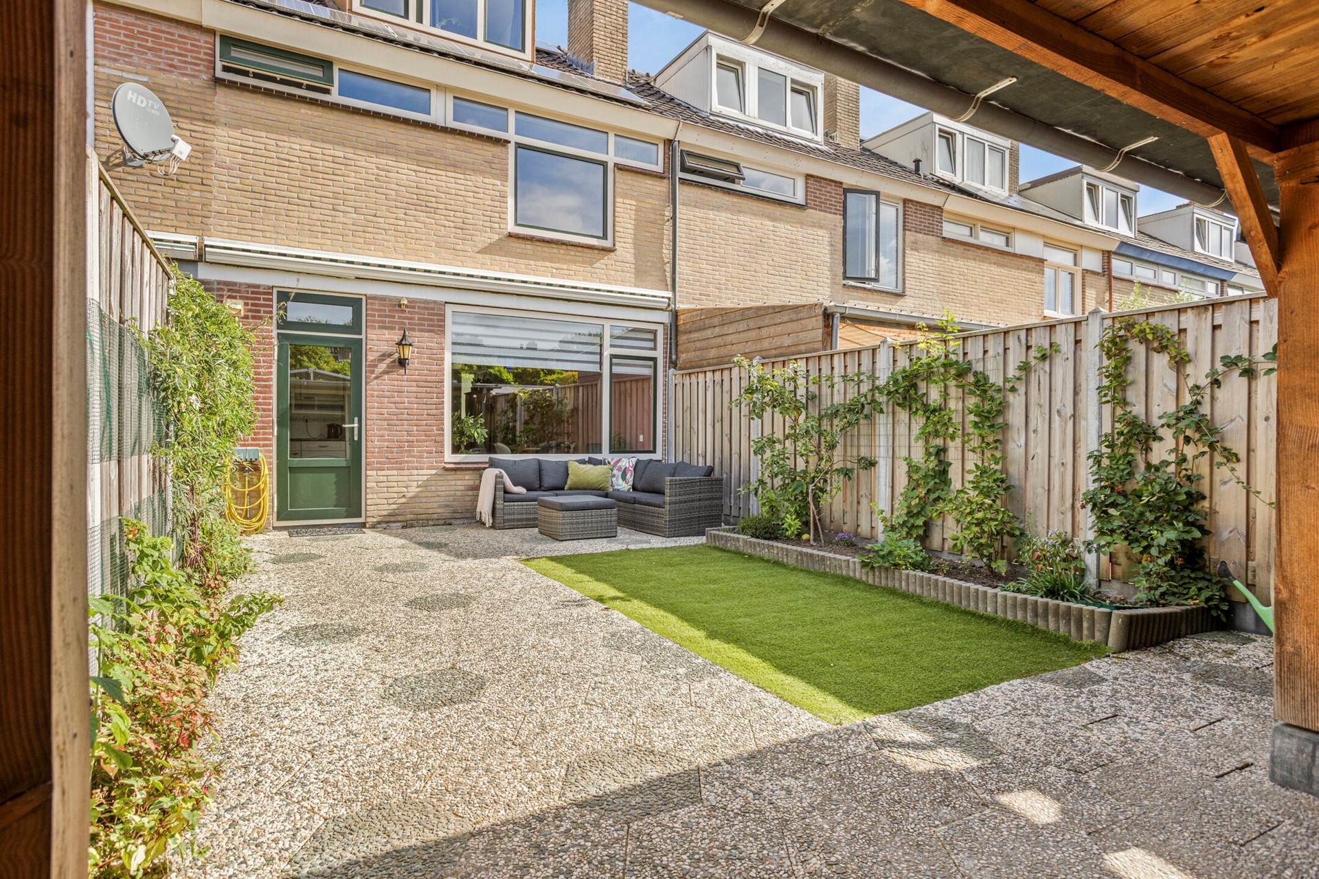 Vanuit de keuken is er toegang tot de zonnige achtertuin, gelegen op het zuidwesten. Over de volledige breedte van de achtertuin is er tegen de schuur aan een overkapping geplaatst. De achtertuin is grotendeels bestraat met grijze tegels en heeft ook een deel kunstgras. Achter in de tuin vinden we nog een ruime schuur met elektra. Naast de schuur is er achterom naar de achtergelegen parkeerplaats. De parkeerplaats biedt heerlijk veel parkeerruimte, maar ook in andere straten van de wijk kan uiteraard geparkeerd worden.