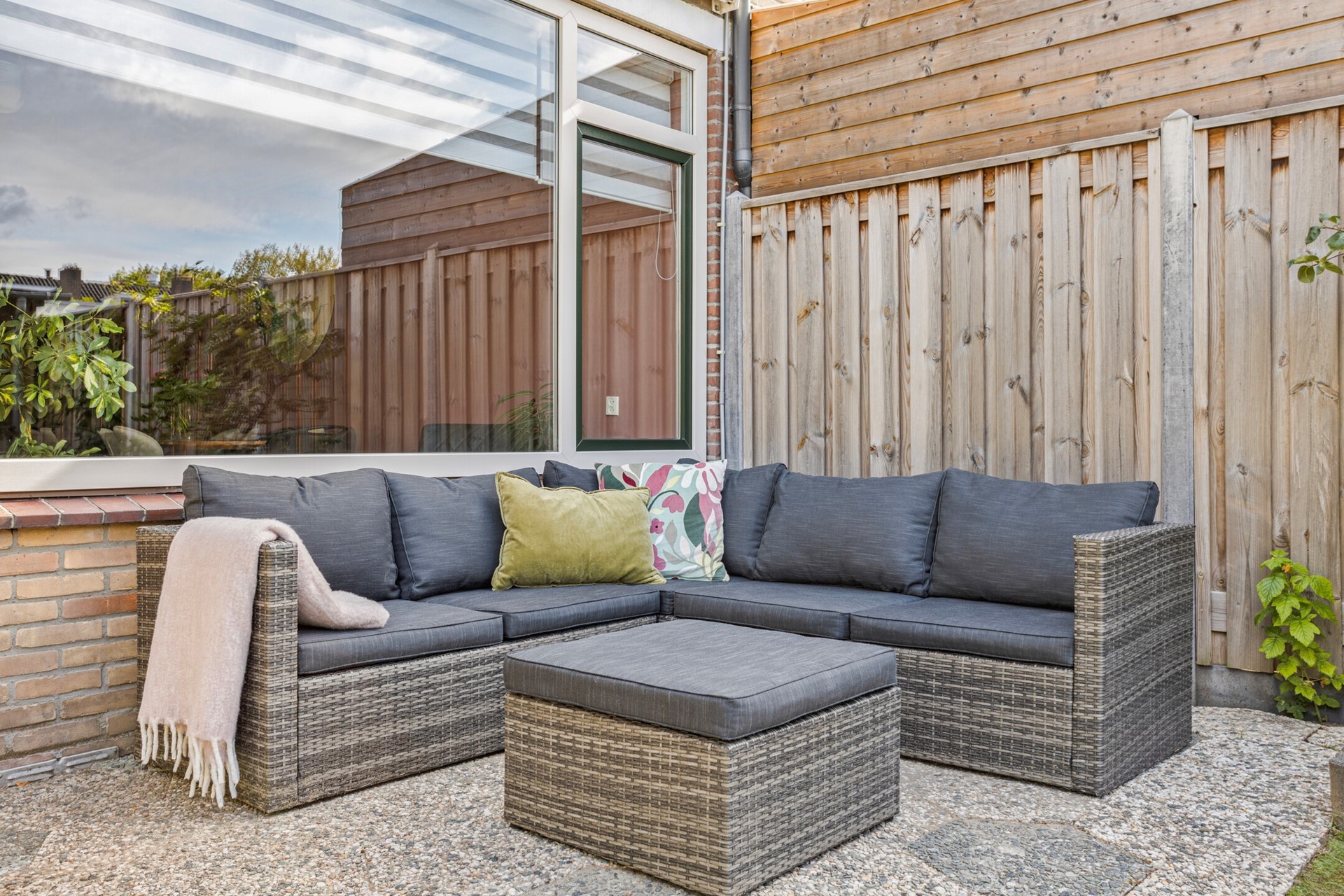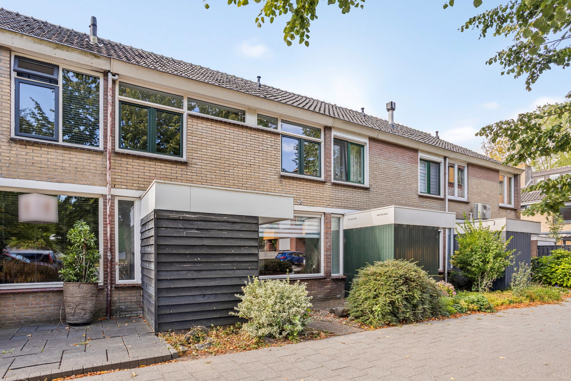 De voortuin heeft mooie groene struiken en heeft een betegeld pad naar de voordeur en voor het woonkamerraam.