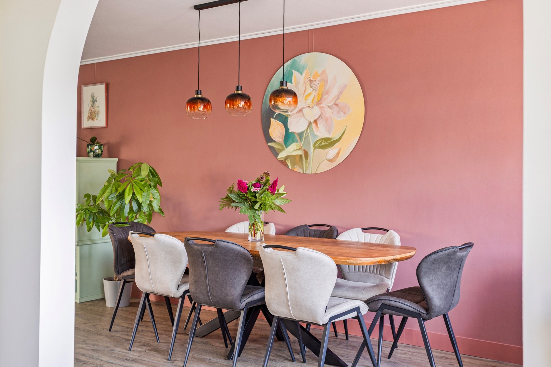 Via de entree komen we de L-vormige woonkamer binnen. Hier ligt een houtlook pvc vloer in een mooie lichte kleur die drempelloos is doorgelegd naar de keuken en de traphal. De gezellige zithoek is gelegen aan de voorzijde van de woning. Er is voldoende ruimte voor een grote hoekbank, salontafel en tv-meubel. Het eetgedeelte bevindt zich aan de achterzijde van de woning, met zicht op de zonnige achtertuin. De woonkamer is heerlijk licht dankzij de grote raampartijen.