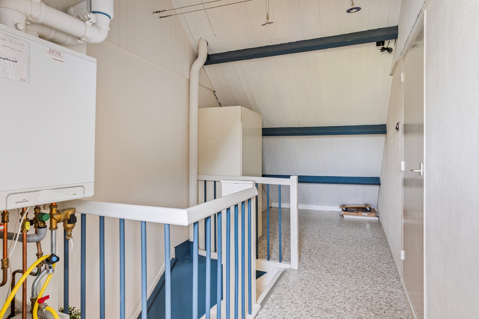 Middels een vaste trap bereiken we de 2e verdieping. De verdieping is opgedeeld in 2 ruimtes: een voorzolder en een slaapkamer. Op de voorzolder bevinden zich de aansluitingen voor de wasmachine en de droger en hier is tevens de CV-ketel (Intergas Kombi 2021) opgesteld. De 2e verdieping heeft een dakkapel, deels op de voorzolder en deels in de slaapkamer. De slaapkamer is heerlijk ruim en biedt veel mogelijkheden.