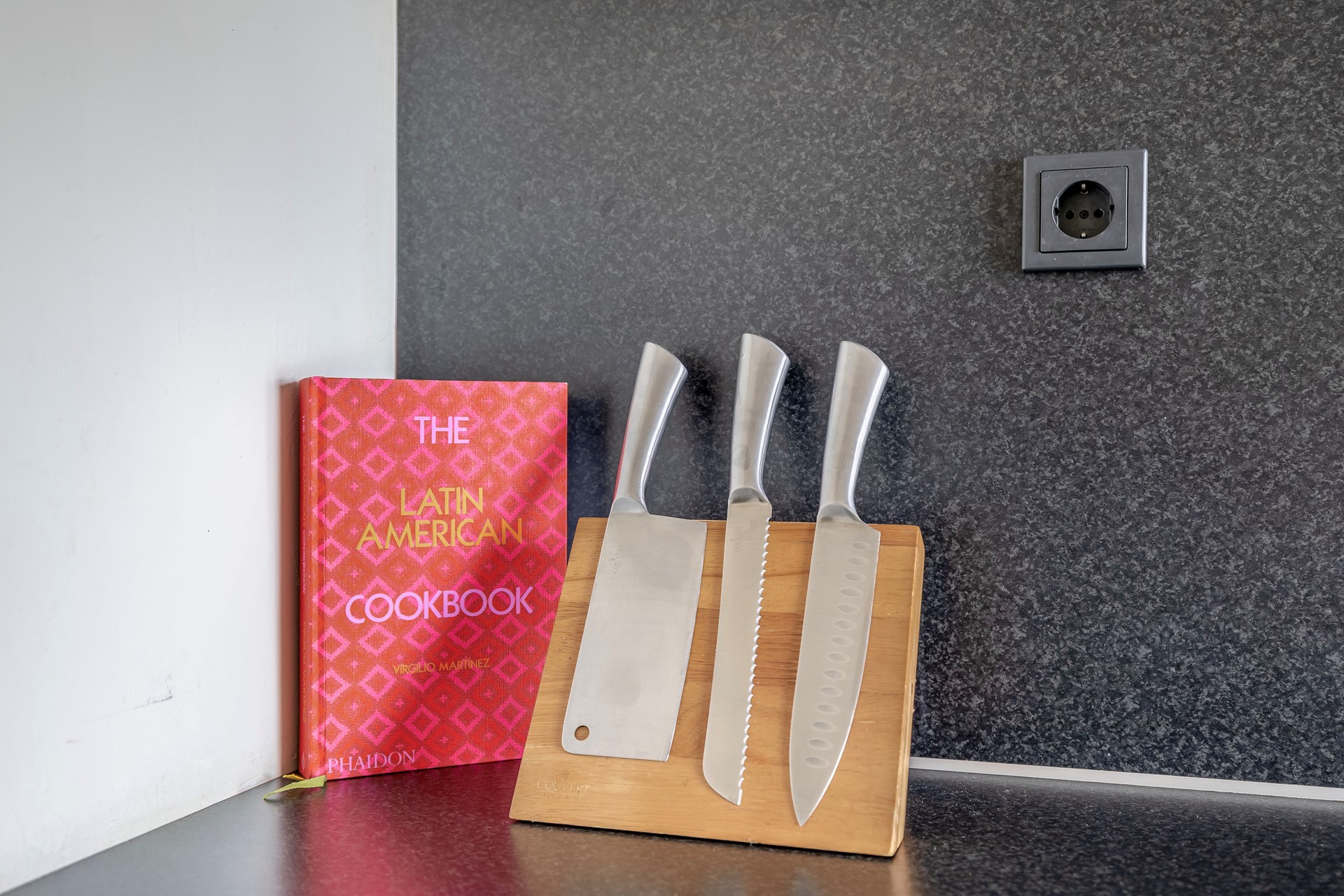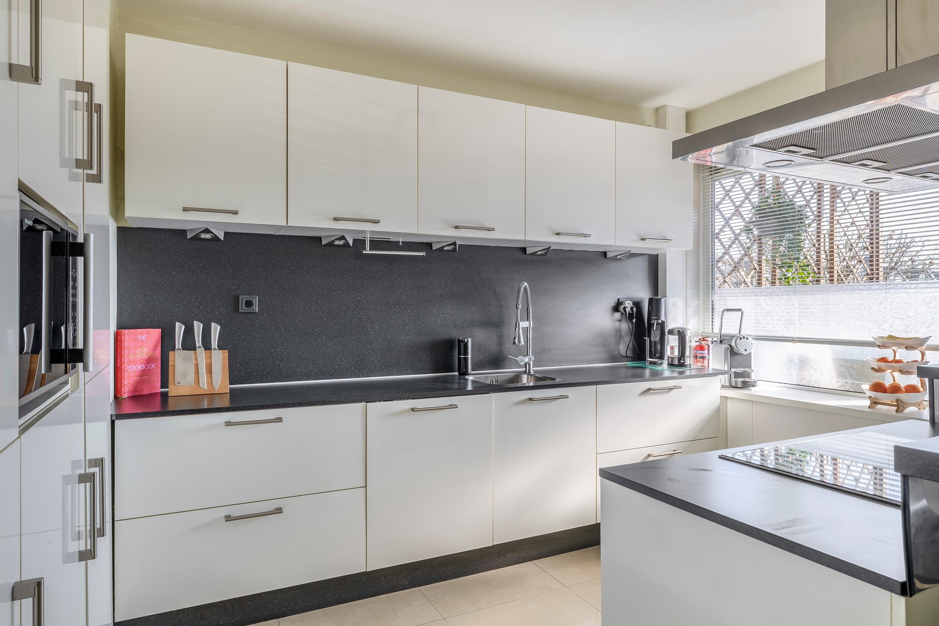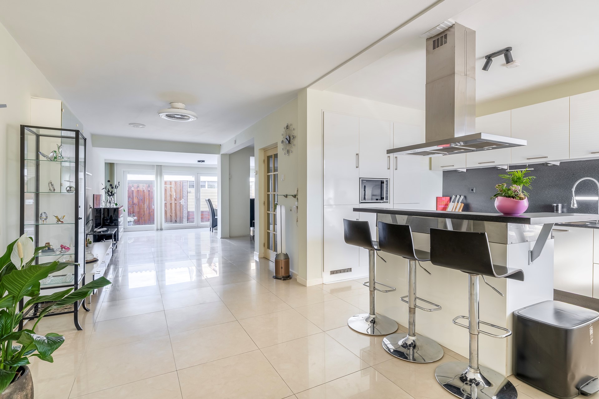 De open keuken heeft een L-vormige opstelling met kookeiland en bar. De hoogglans witte fronten combineren mooi met het antracietkleurige werkblad. De keuken is uitgerust met een inductiekookplaat met afzuigkap, een koelkast (2023), vaatwasser (2023), magnetron en een elektrische boiler (2024). Daarnaast is er een praktische bergkast onder de trap, bereikbaar vanuit de keuken.