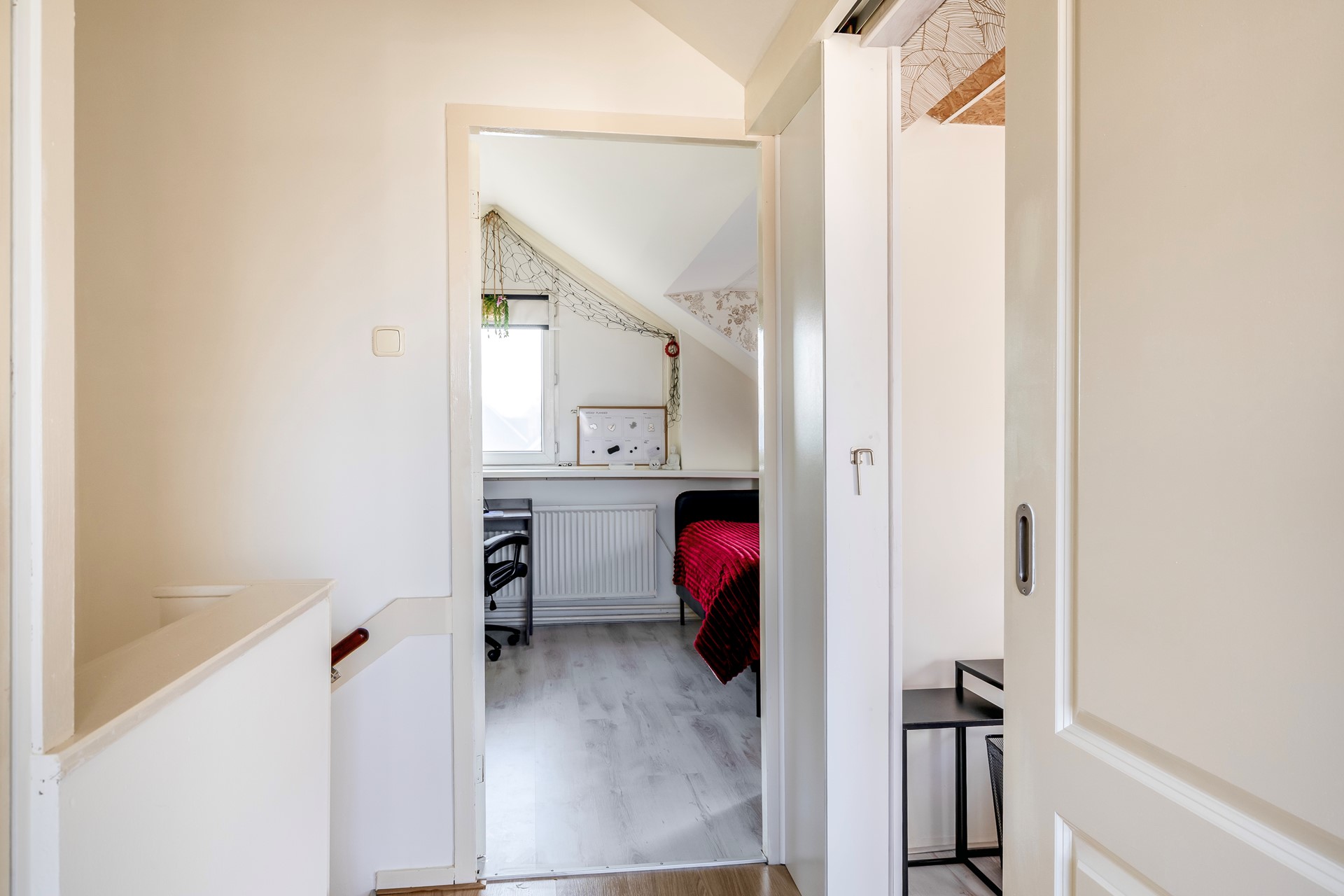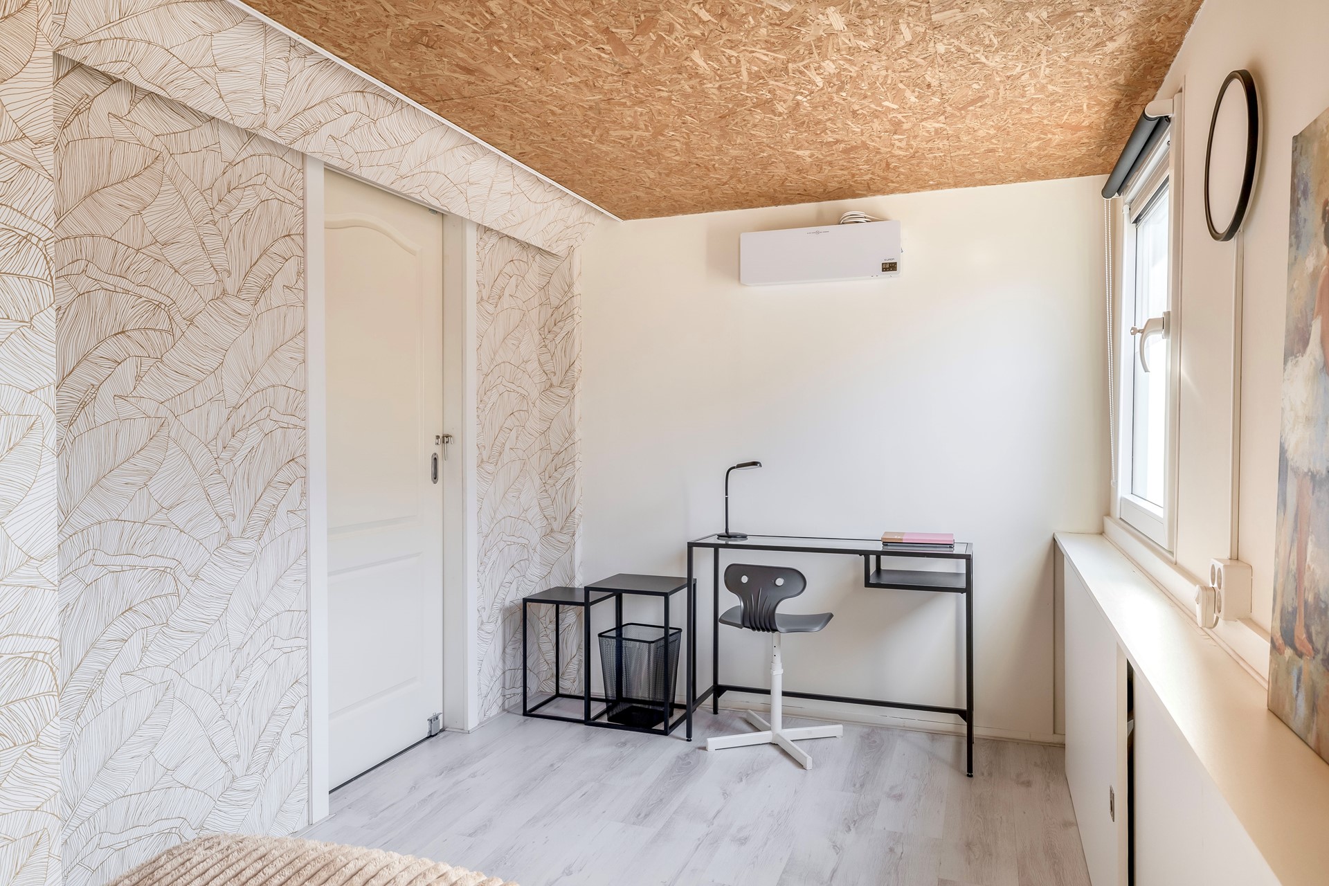 Via een vaste trap bereik je de tweede verdieping, die is vergroot door een dakkapel (2024). De overloop geeft toegang tot twee slaapkamers, de wasruimte en een vaste kast met de cv-ketel en warmtepomp. De cv-ketel en warmtepomp zijn buiten gebruik; de airco’s verzorgen de verwarming en de boiler het warme water.