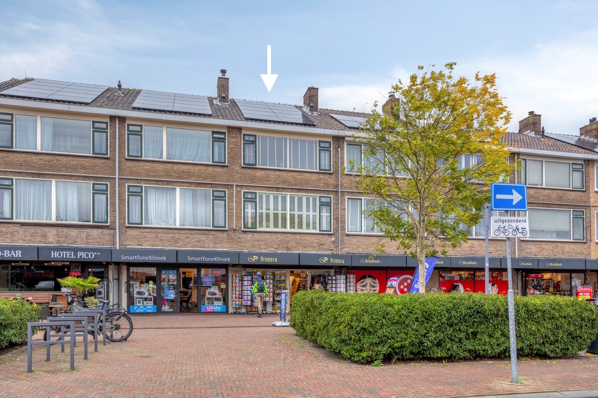 De woningen zijn boven de winkels gelegen dus via de trap in de afgesloten portiek aan de zijkant van het gebouw komen we aan op de 1e verdieping.