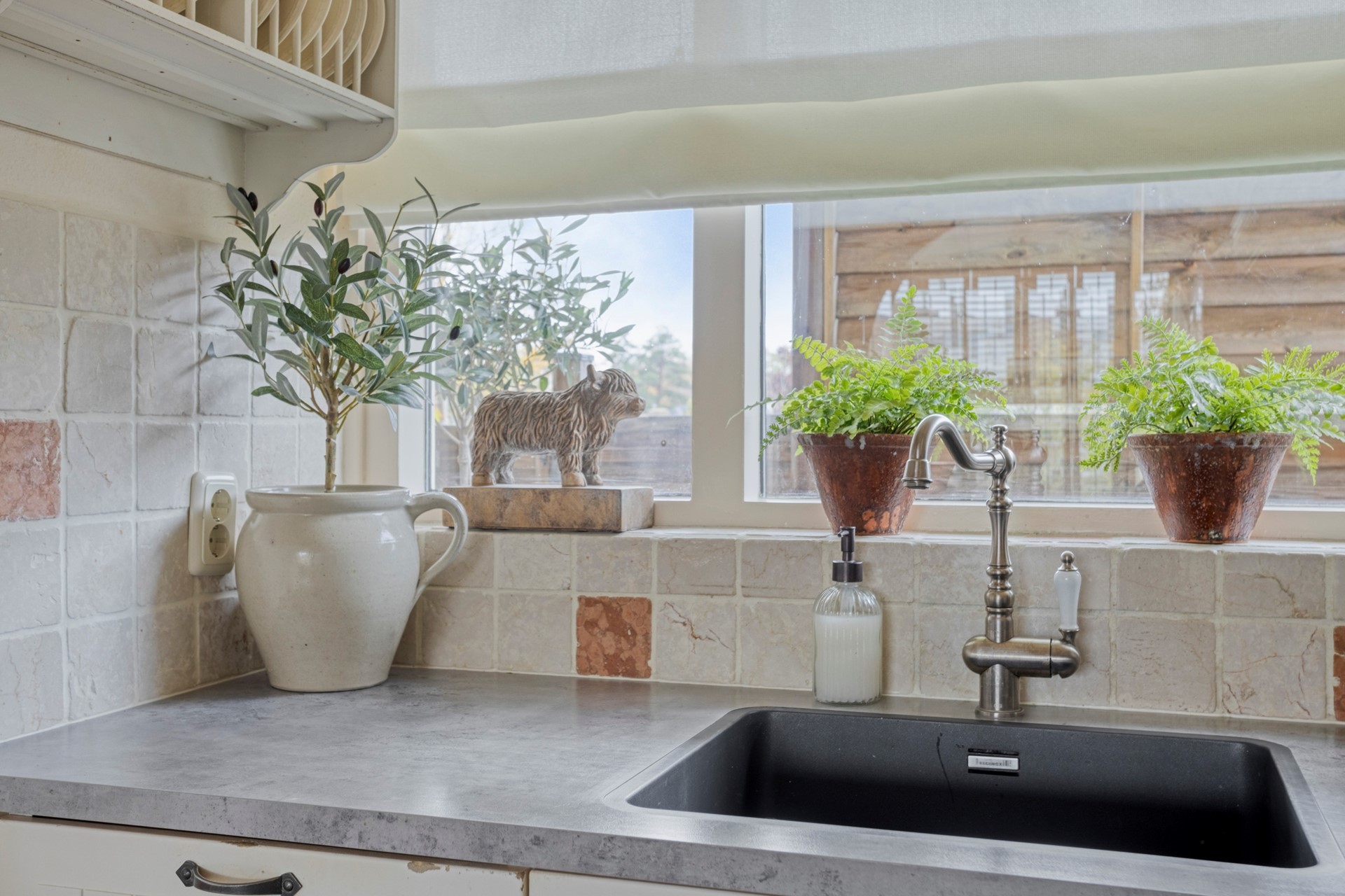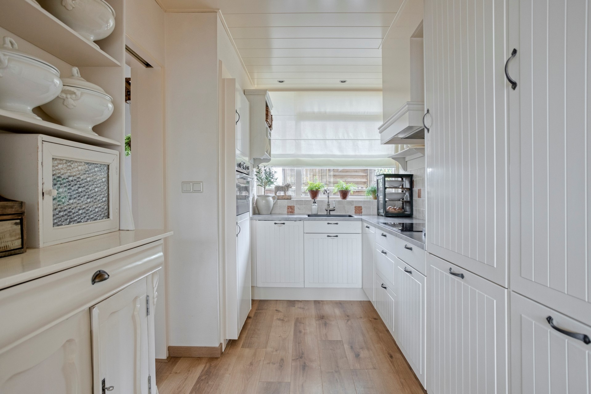 We gaan verder naar de keuken welke is uitgevoerd in gebroken wit met een grijs, kunststof aanrechtblad. De volgende apparatuur vinden we hier terug: koelkast, vriezer, combimagnetron, vaatwasser, kookplaat met een afzuigkap erboven. De achterwand is gedeeltelijk betegeld.