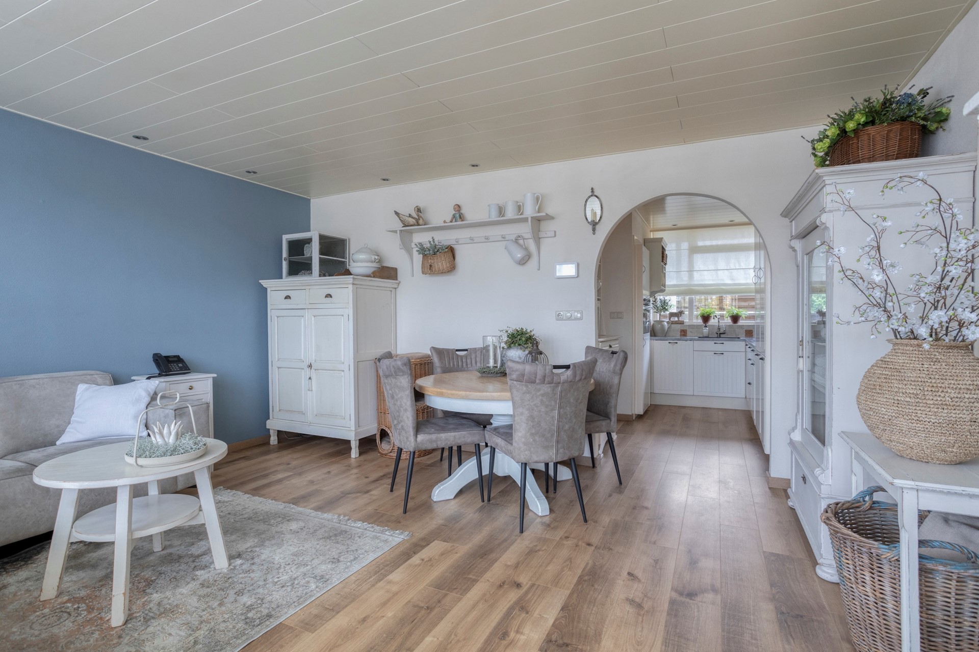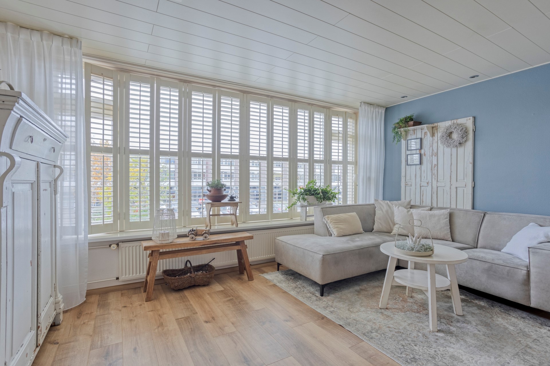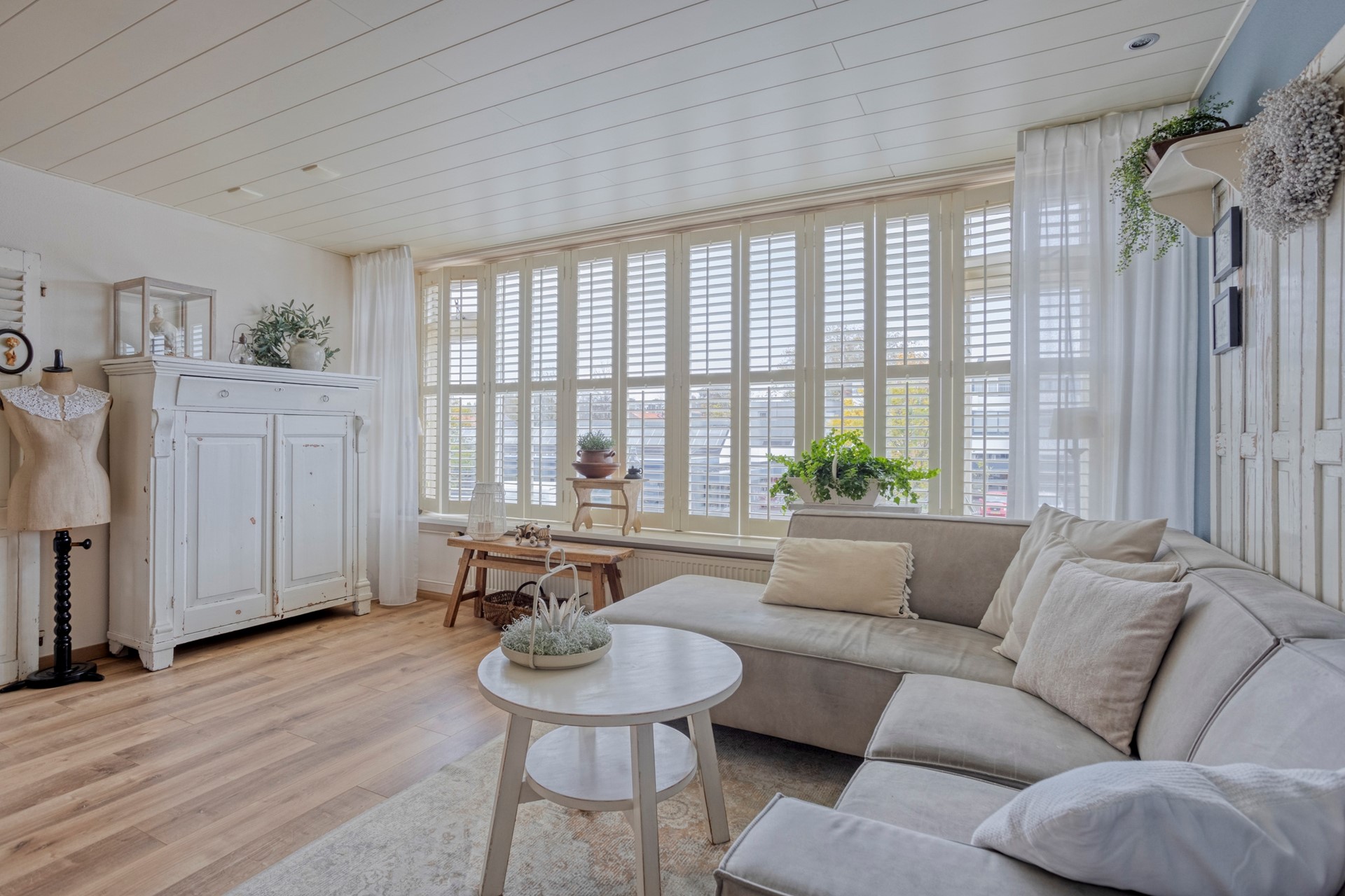 De woonkamer heeft grote raampartijen, met uitzicht op het centrum. De op maat gemaakte shutters blijven achter voor de nieuwe bewoners. De gehele verdieping heeft dezelfde, warme laminaatvloer. In de woonkamer genoeg plek voor een hoekbank, tv-meubel, salontafel een buffetkast en de eettafel.