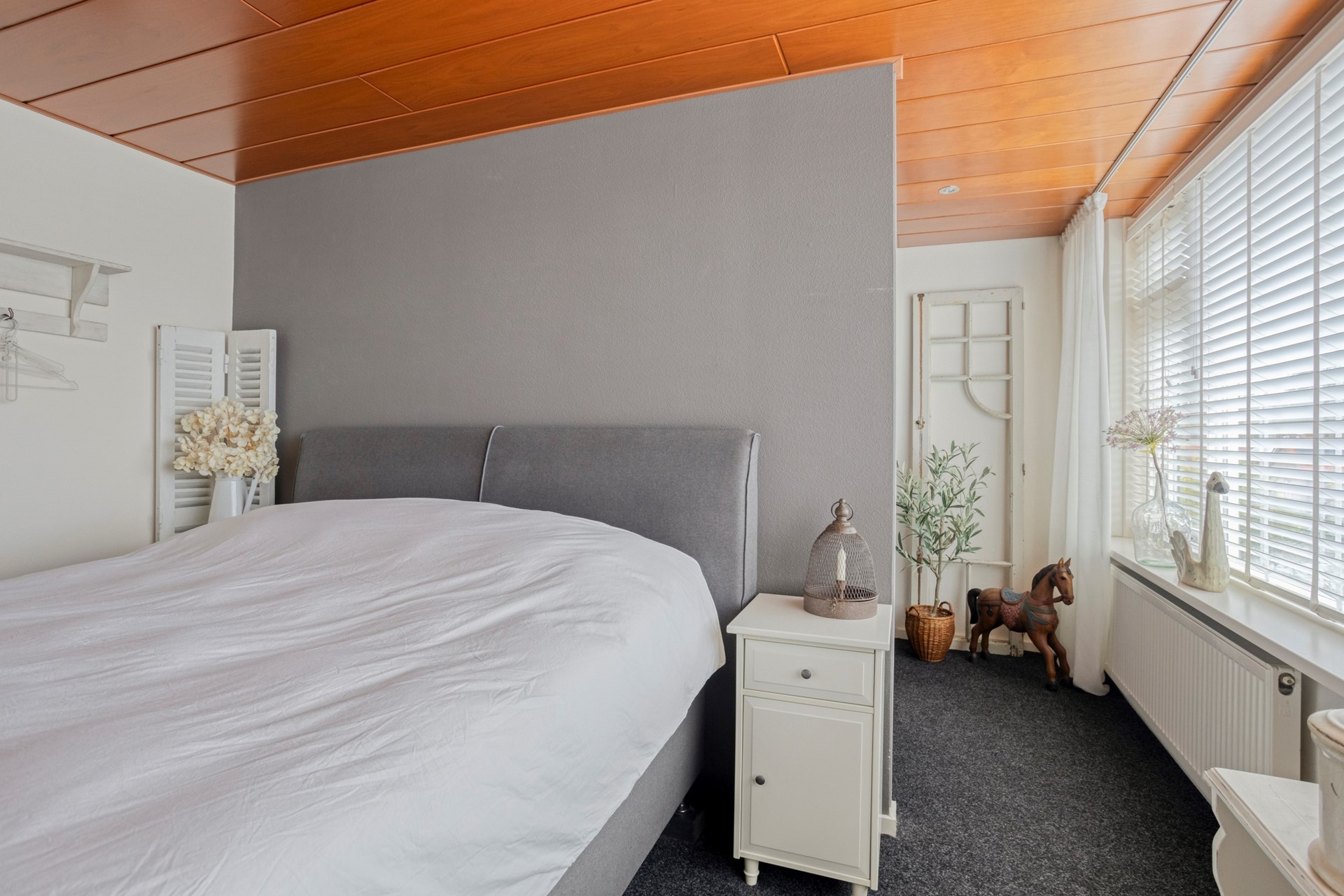 De hal op de 2e verdieping geeft toegang tot de 2 slaapkamers, de badkamer en de trapopgang naar de volgende verdieping. We beginnen bij de slaapkamer aan de kant van het centrum. Op de vloer antracietkleurig tapijt. Deze kamer is voorzien van een inloopkast, achter de muur waar het bed tegen aan staat. Ideaal!