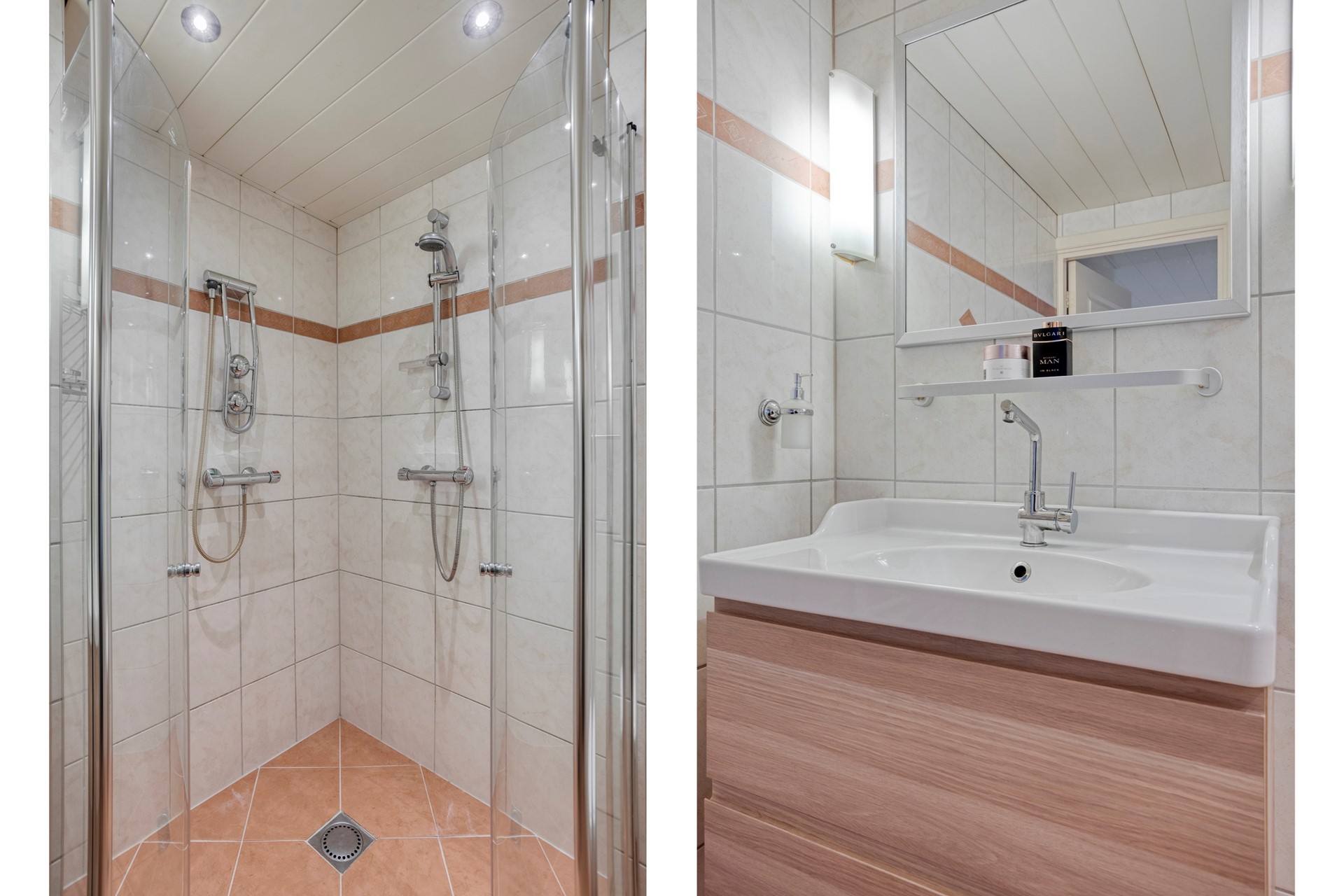 De badkamer is volledig betegeld in de tinten gebroken wit met terracottakleur. De inloopdouche is voorzien van 2 douches, 1 enkele en één met dubbele douchekop. De wastafel heeft 2 brede onderladen uitgevoerd in houtlook en een spiegel erboven met daarnaast verlichting. Er is een toilet.