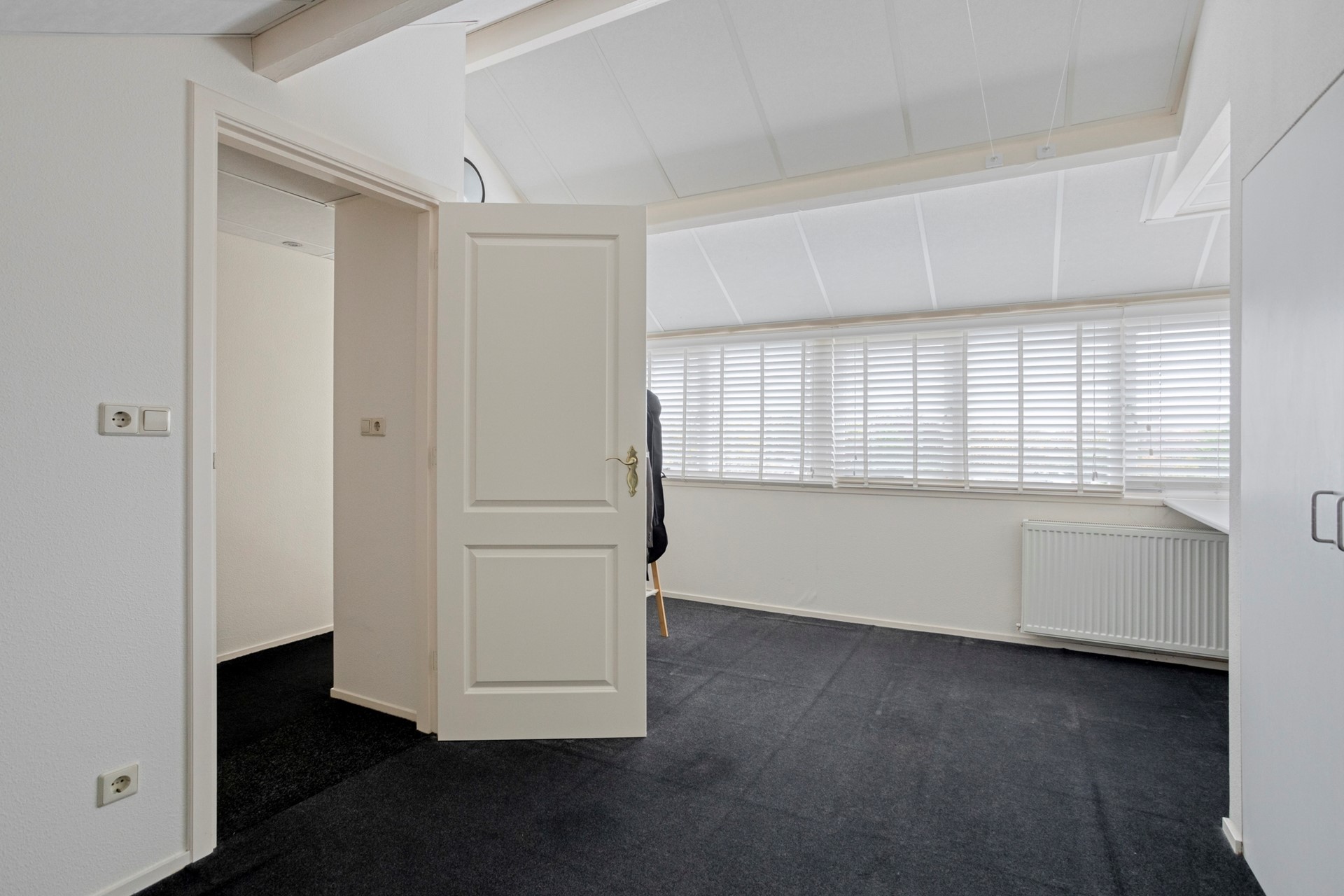 Slaapkamer 2 heeft antracietkleurig tapijt en een vaste kast.