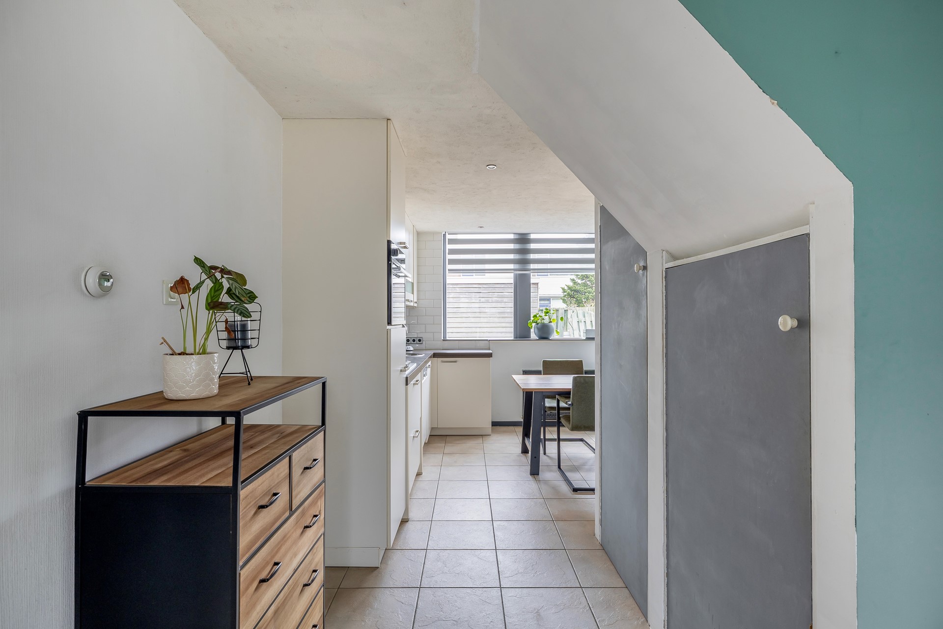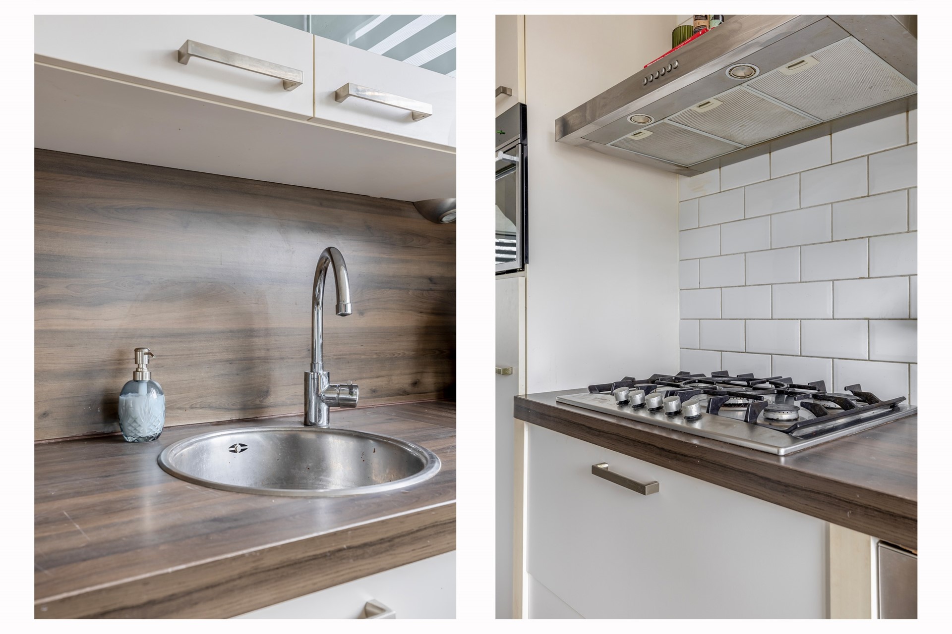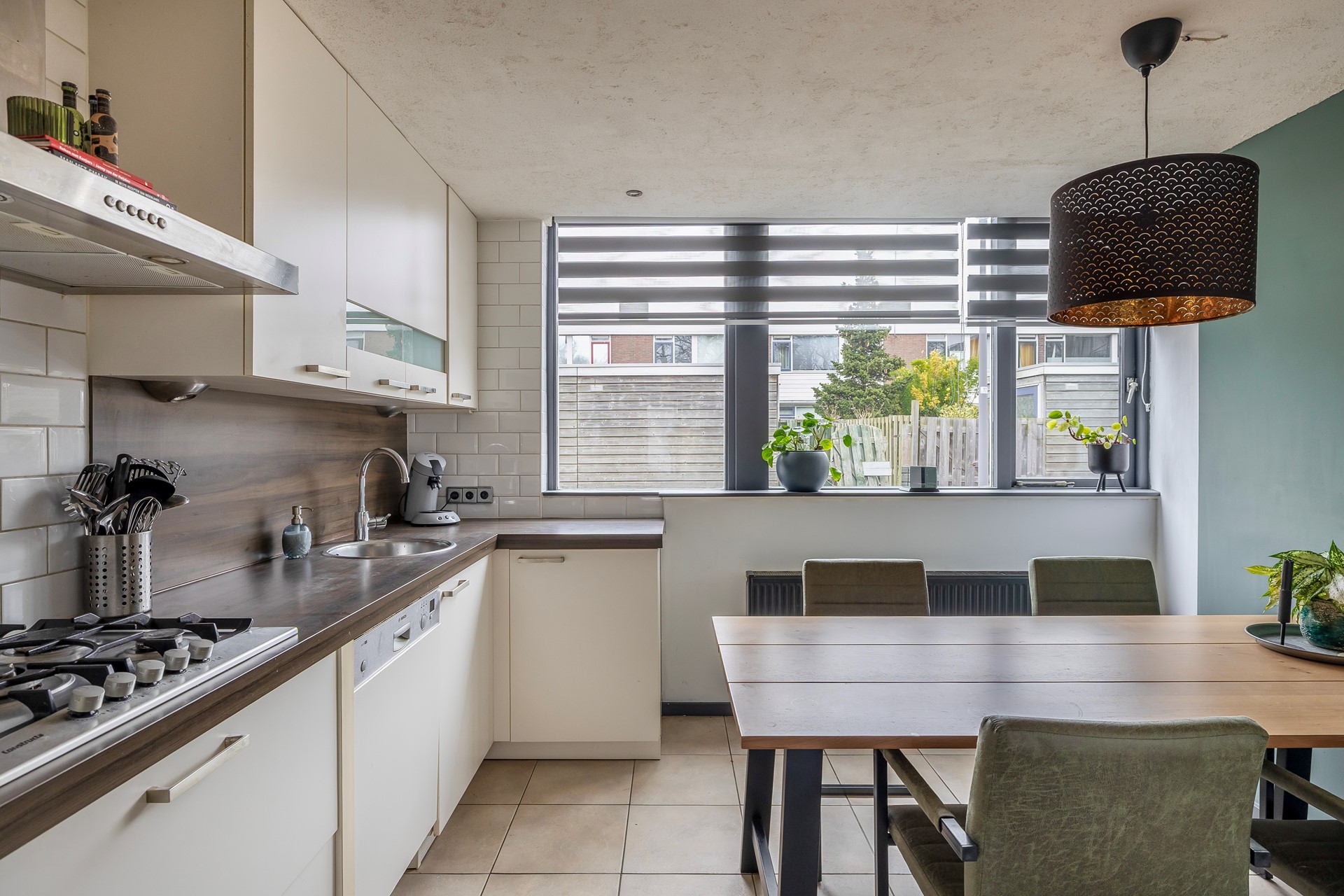 De keuken is gelegen aan de voorzijde van de woning en vergroot door de berging erbij te betrekken. Daardoor is er een woonkeuken ontstaan met ruimte voor een eettafel. De keuken is voorzien van diverse apparatuur: een 5-pits gaskookplaat, een rvs-afzuigkap, een vaatwasser, een koelkast en een combimagnetron. De keukenkasten zijn uitgevoerd in gebroken wit met een houtlook aanrechtblad. Deze houtlook is doorgevoerd op de achterwand, met achter de kookplaat witte metrotegels. De keuken heeft elektrische vloerverwarming.