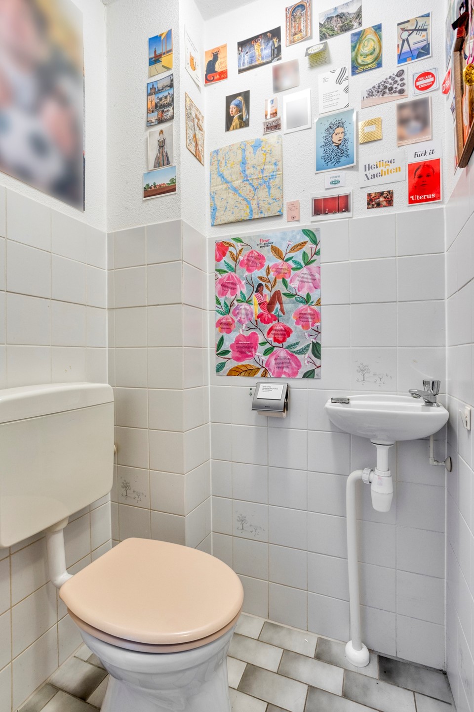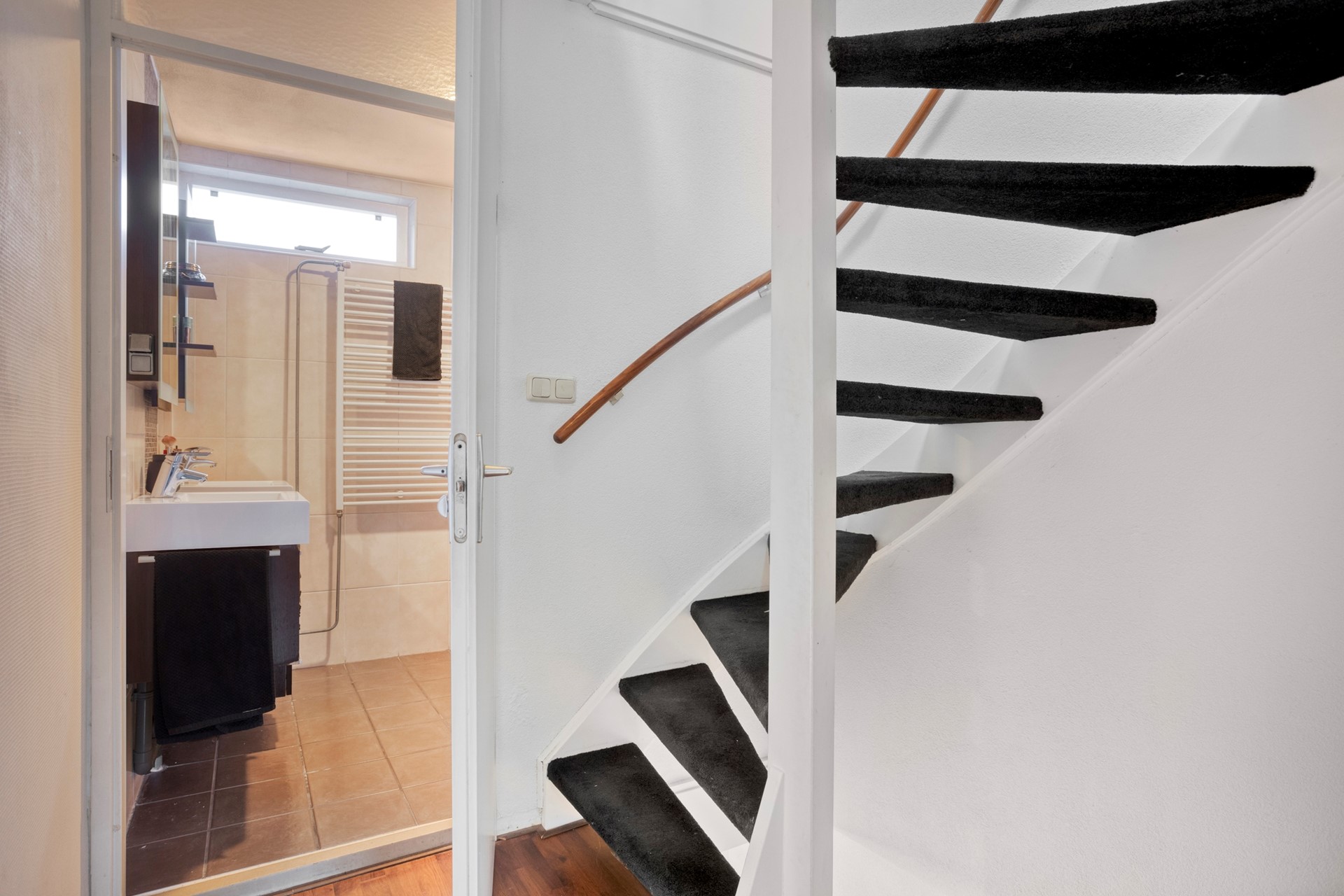 Entree, hal voorzien van meterkast, trapkast, trapopgang naar de 1e verdieping en het toilet. Het toilet is half betegeld met een lichte wandtegel en heeft een wit/grijze vloertegel. Er is een fonteintje aanwezig.