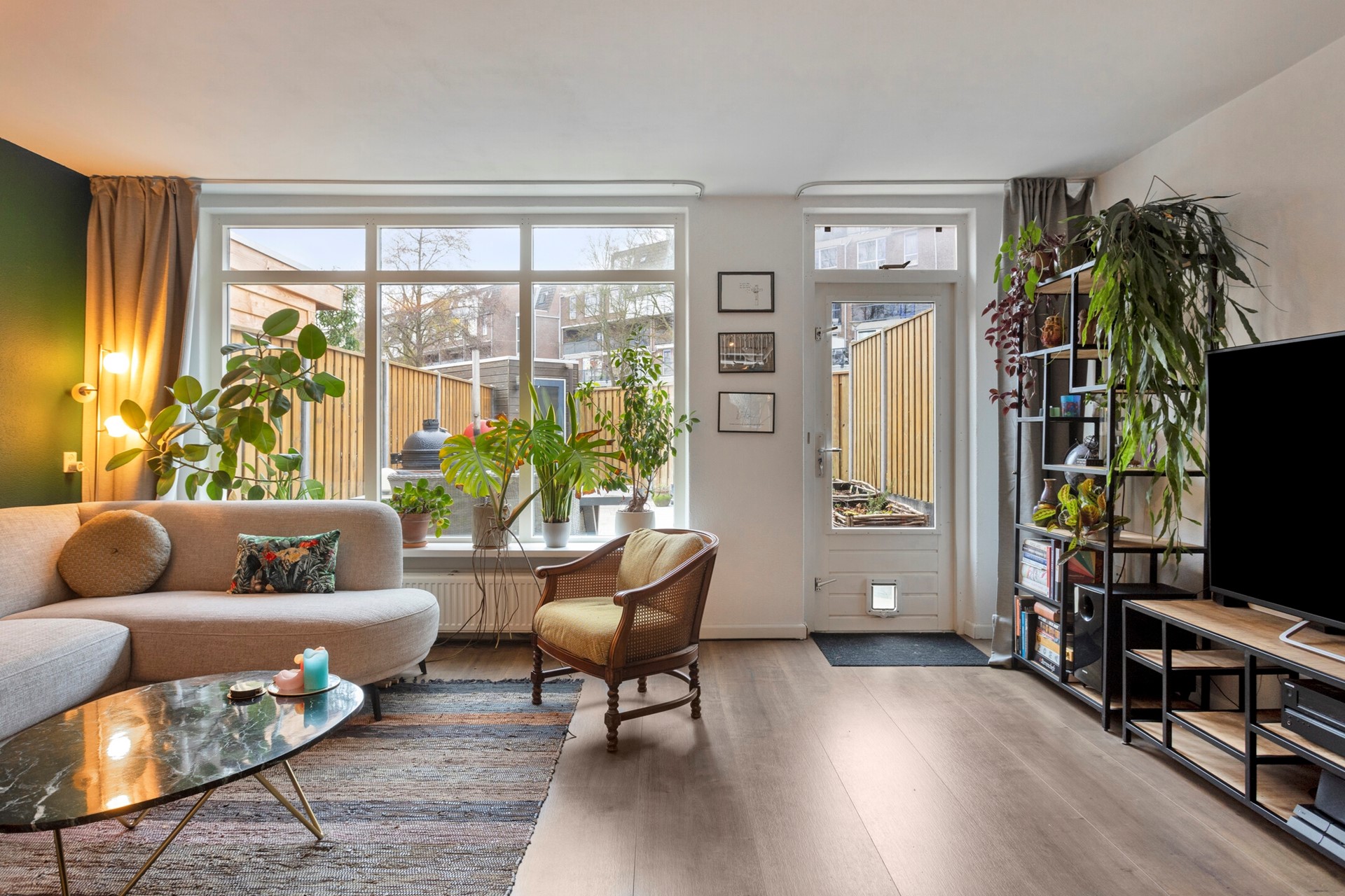 Vanuit de zithoek heeft u toegang tot de achtertuin, gelegen op het noorden. De tuin is volledig betegeld, voorzien van moderne schuttingen, een houten berging met elektra en beschikt over een achterom. Boven het woonkamerraam hangt een handbedienbaar zonnescherm.