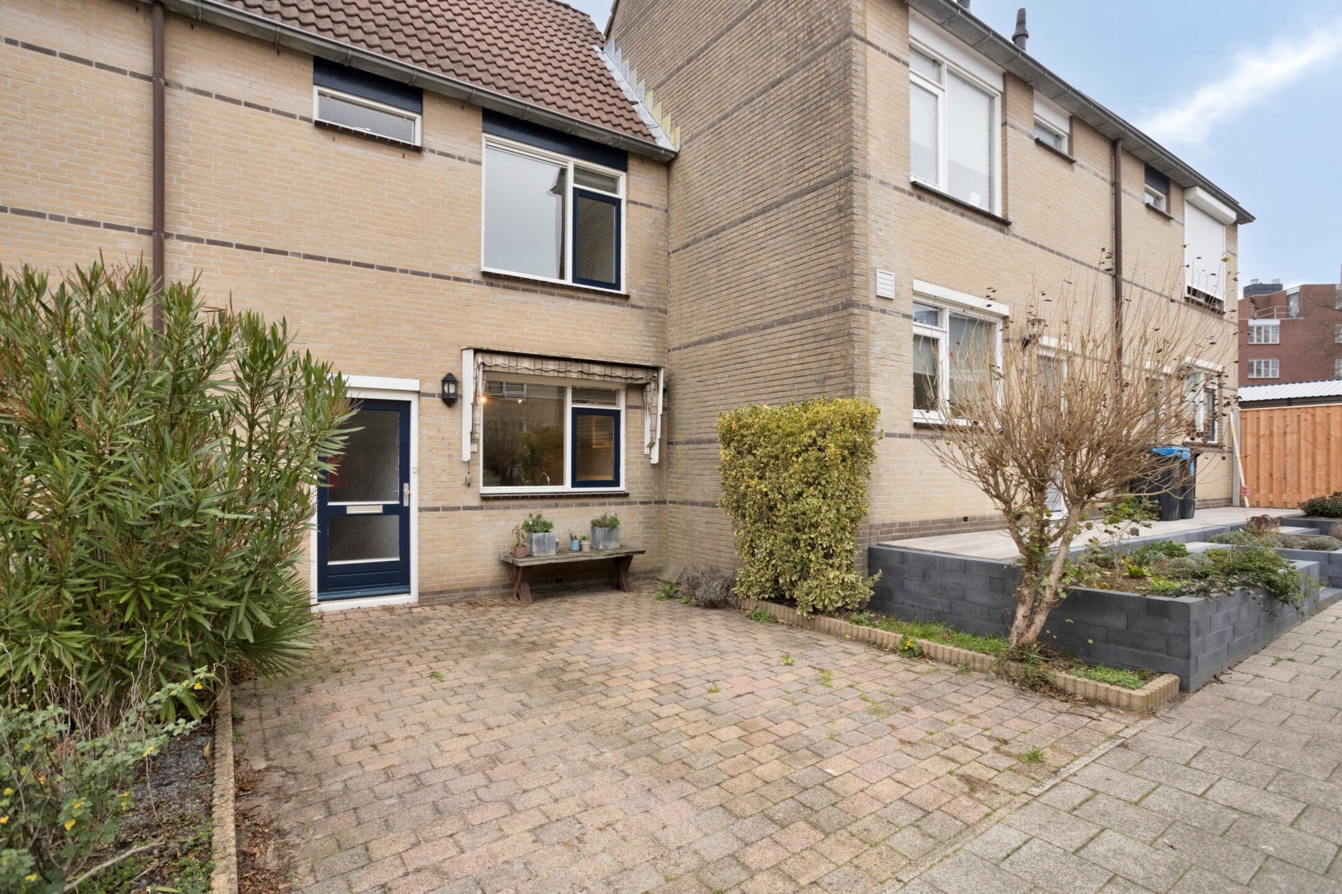 Aan de voorzijde beschikt de woning over een eigen oprit. De voortuin is grotendeels betegeld met klinkers en er is ruimte om 1 auto te parkeren.