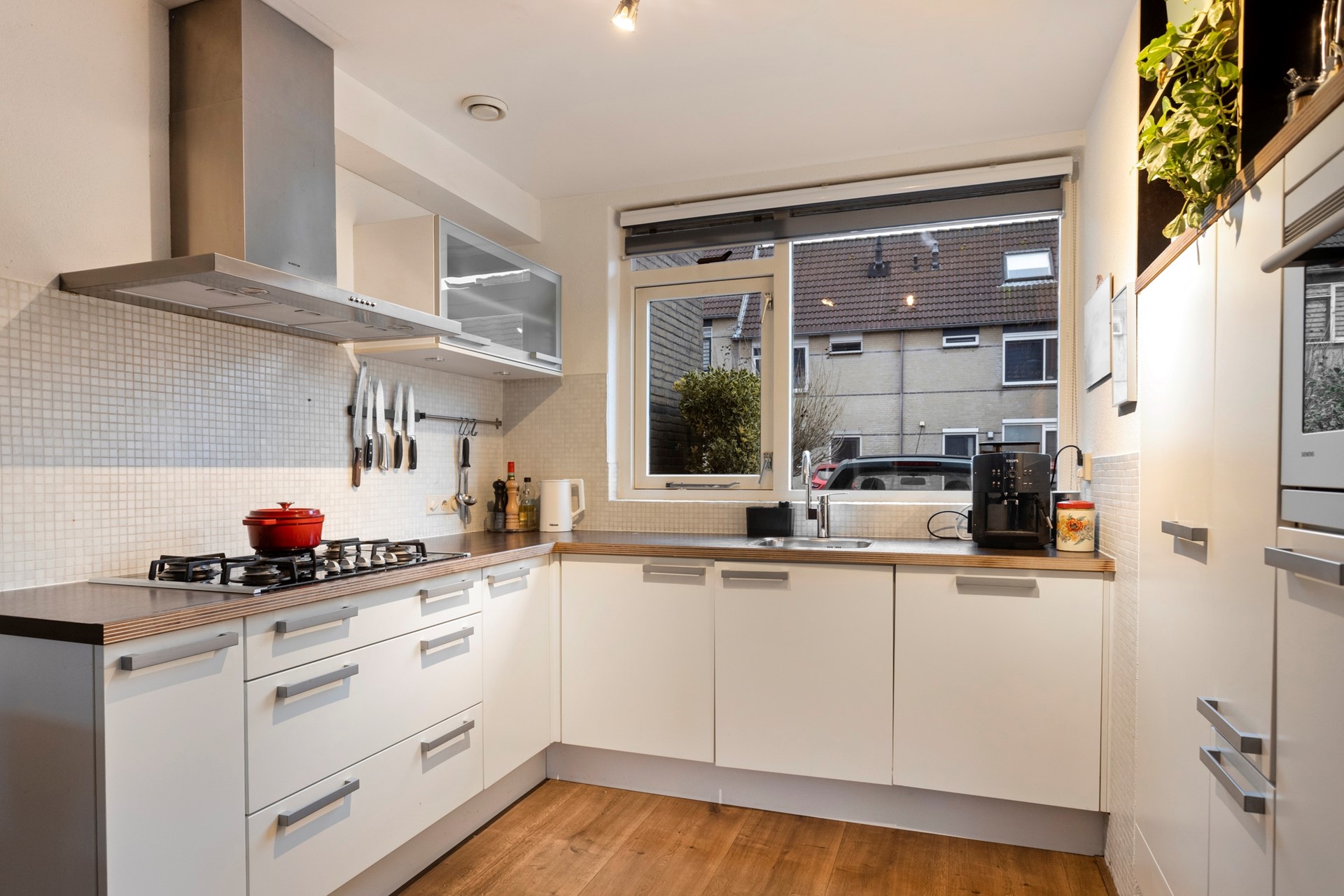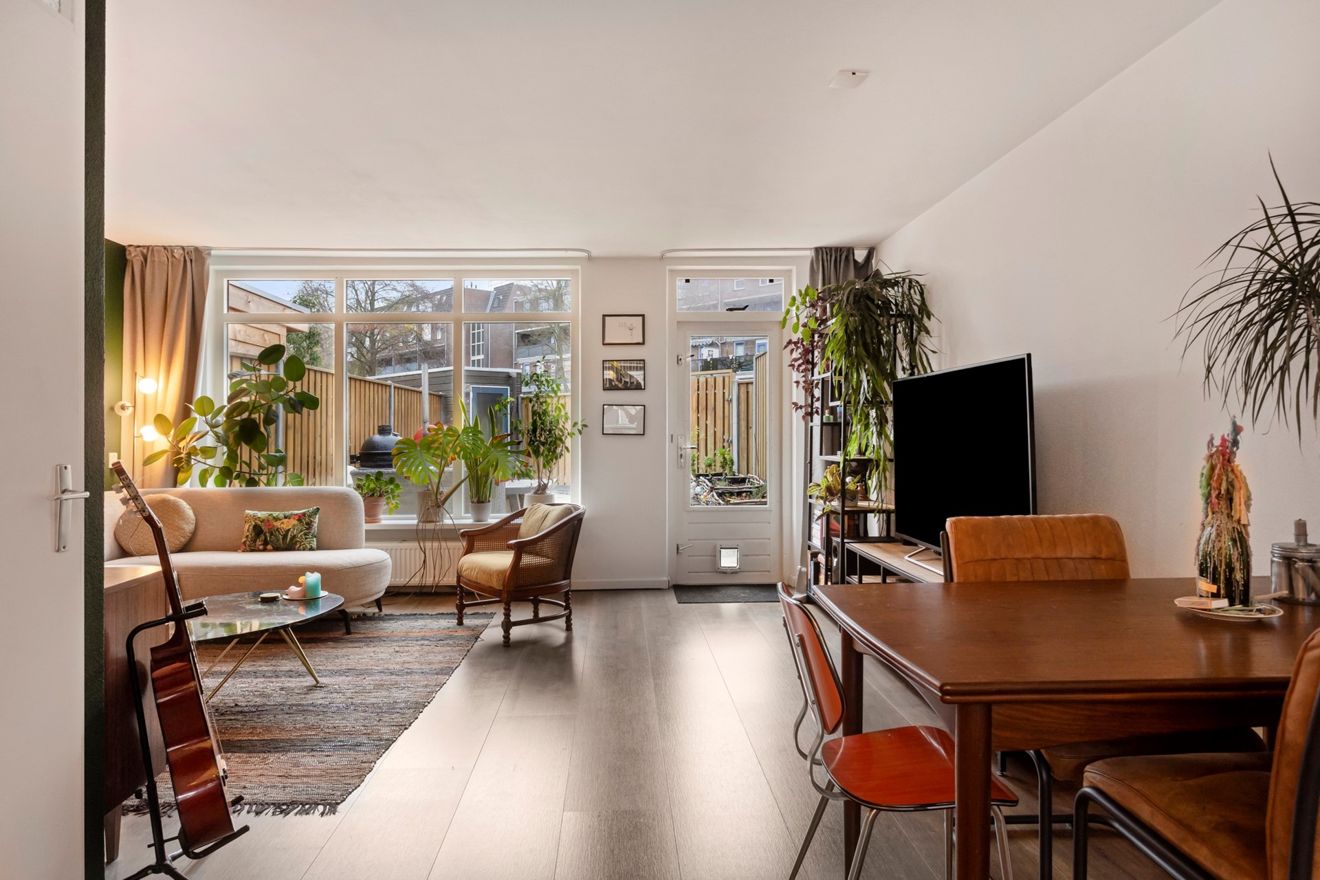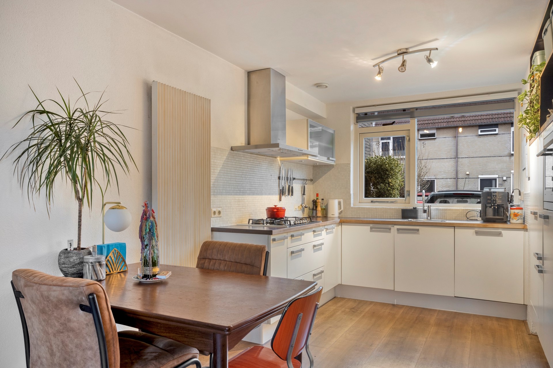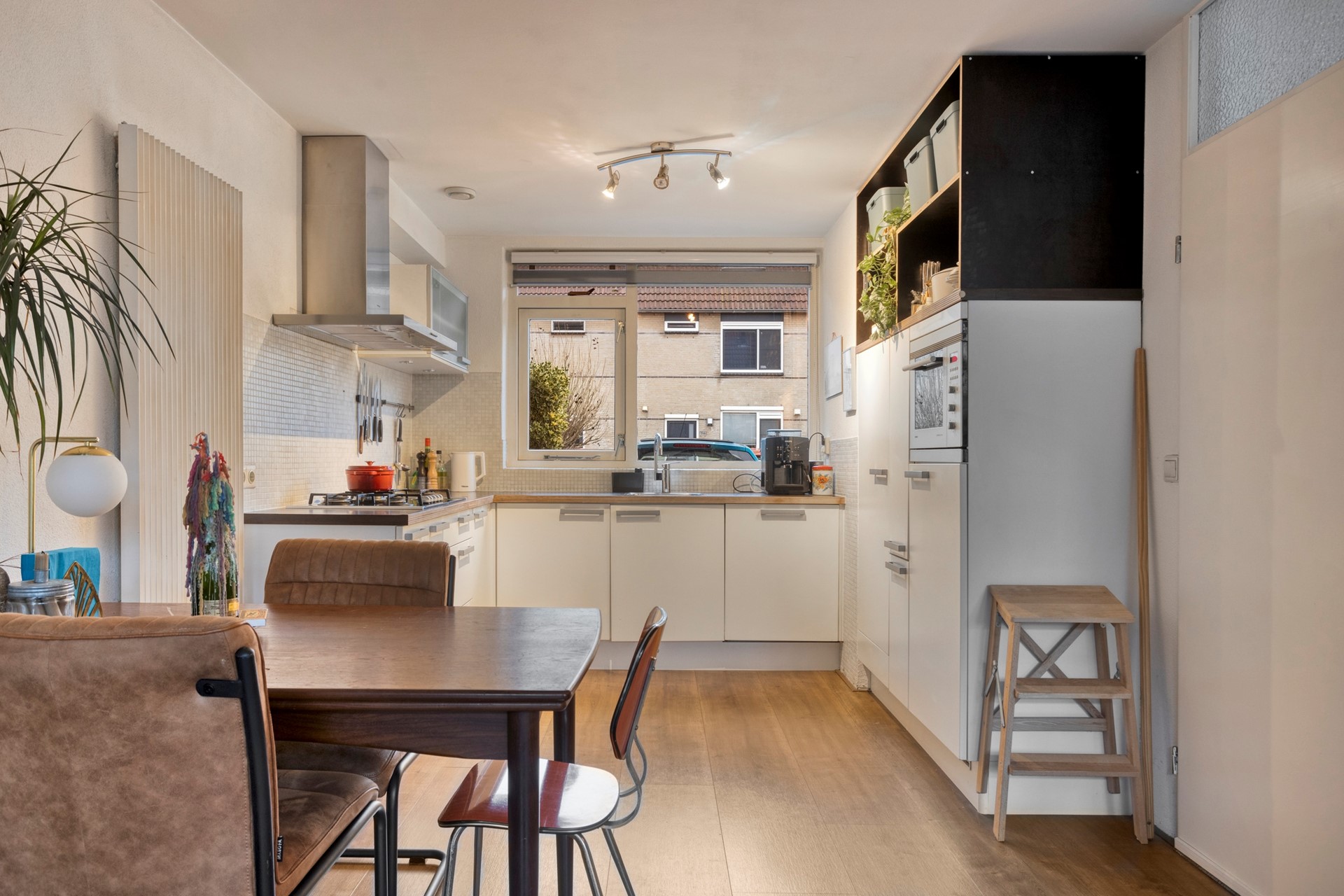 Over de gehele begane grond ligt een laminaatvloer in een warme, donkere tint. De lichte woonkamer beschikt over een grote raampartij aan de achterzijde met zicht op de tuin. De open keuken heeft een U-vormige opstelling en is voorzien van de volgende inbouwapparatuur: een koelkast, vriezer, vaatwasser, combi-oven en een gasfornuis met daarboven een afzuigkap. De opstelling zorgt voor veel ruimte en een fijne, directe verbinding met de eethoek.