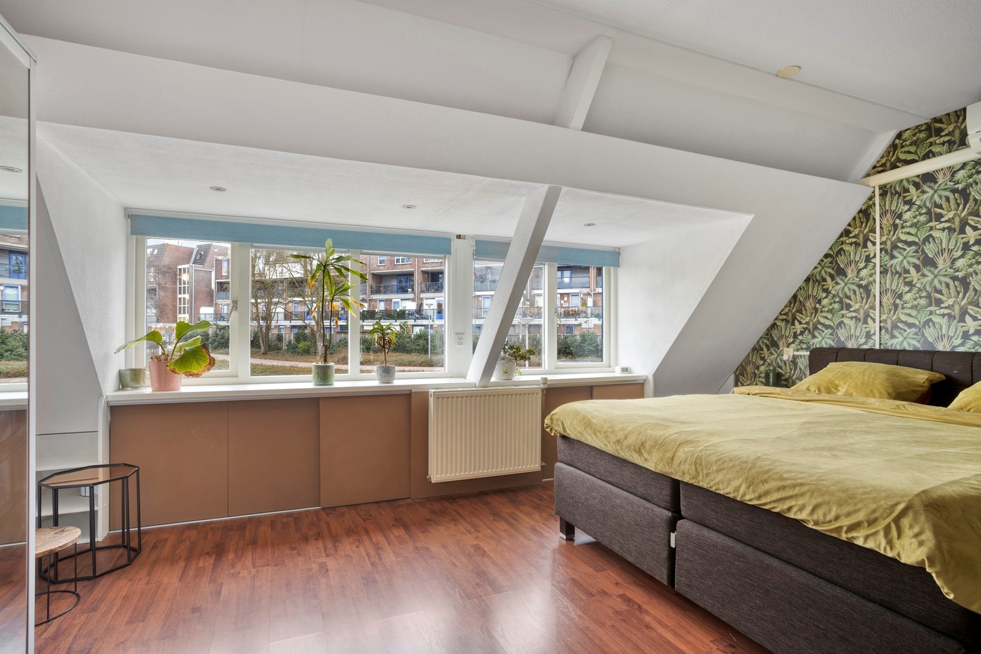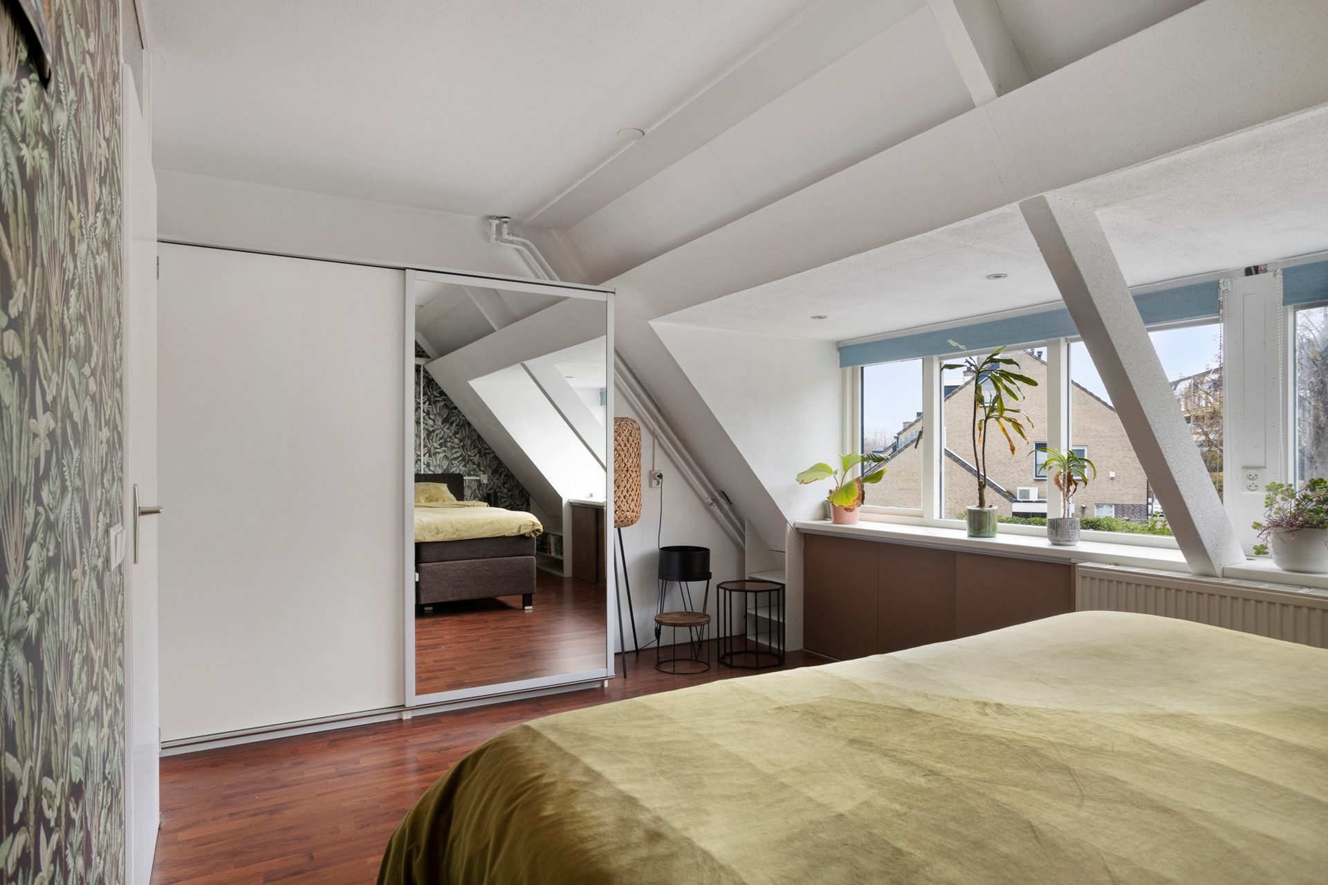 De overloop biedt toegang tot 2 slaapkamers, de badkamer en de trapopgang naar de 2e verdieping. De grootste slaapkamer bevindt zich aan de achterzijde en heeft uitzicht op de achtertuin. Deze slaapkamer is vergroot door van 2 slaapkamers 1 kamer te maken. De dakkapel zorgt voor extra ruimte en lichtinval. Deze slaapkamer is voorzien van airco.