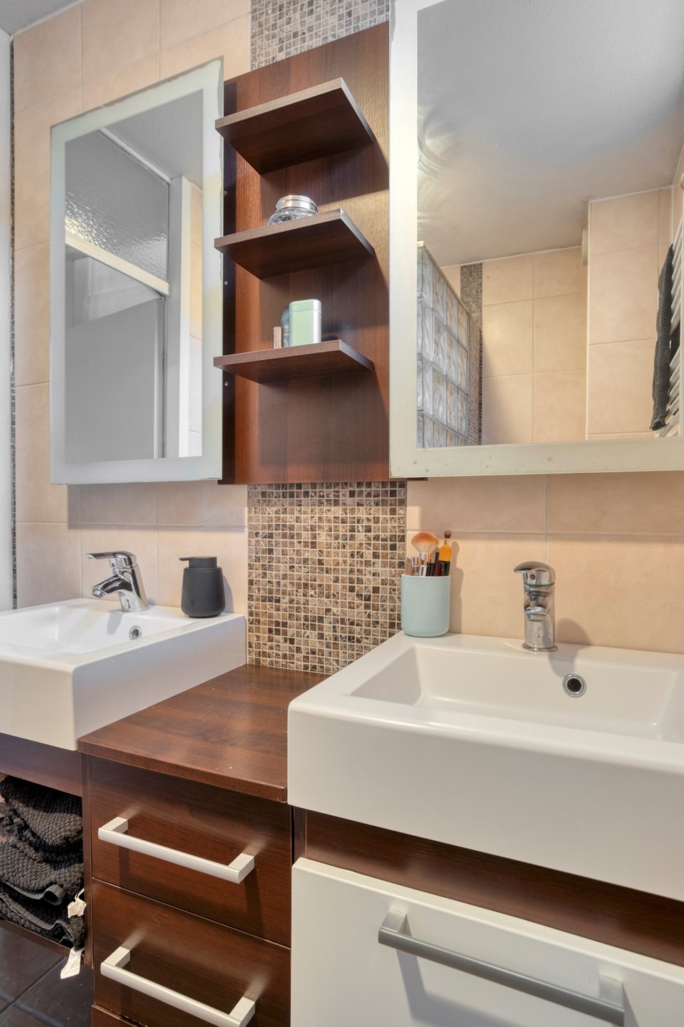 De badkamer is volledig betegeld met zandkleurige wandtegels en donkere mozaïektegels. Op de vloer ligt een donkerbruine tegel en voor de afscheiding van de inloopdouche is gekozen voor glazen bouwstenen. De badkamer is voorzien van een wastafelmeubel met dubbele wasbakken en daarboven spiegels. Daarnaast is er een raam aanwezig, wat zorgt voor prettige natuurlijke ventilatie.