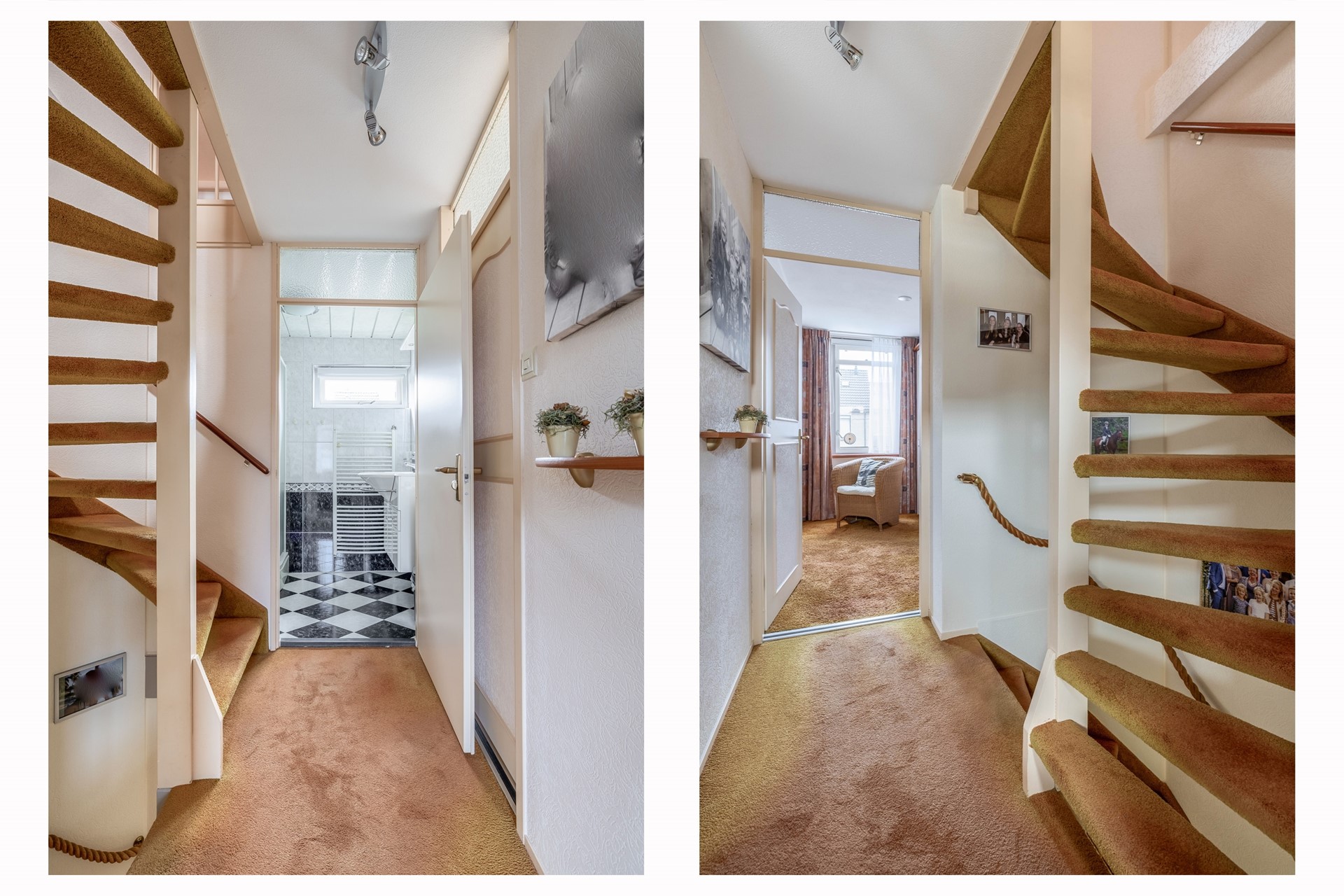 Boven komen we aan op de overloop met toegang tot twee slaapkamers, de badkamer en de trapopgang naar de tweede verdieping. De gehele verdieping is voorzien van bruine vloerbedekking.