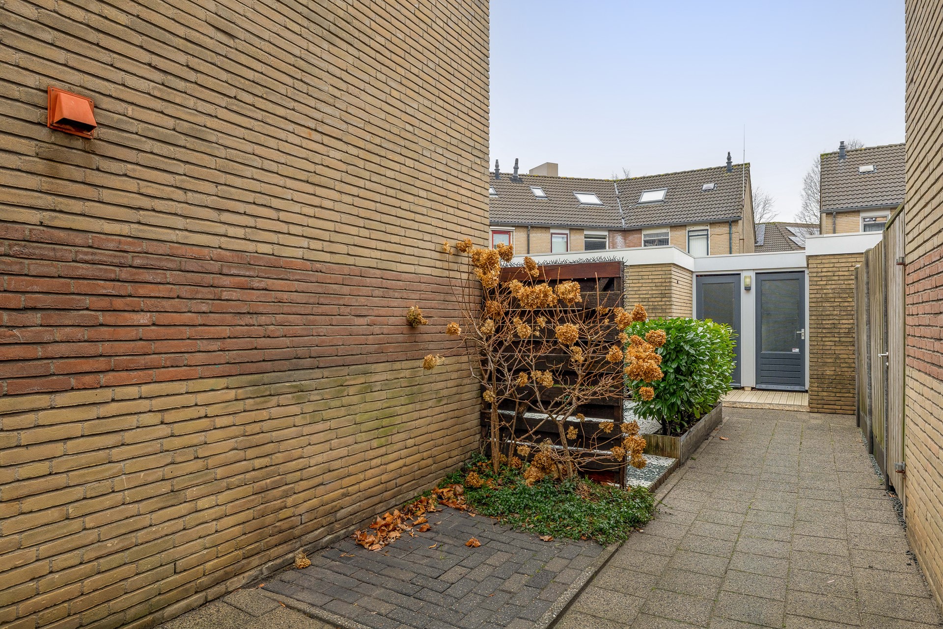 Aan de achterzijde van de woning bevindt zich een op het oosten gelegen en grotendeels betegelde tuin met achterom en een stenen berging. Ook hier is elektra aanwezig en een buitenkraan. Over de gehele breedte van de woning is een handbediend zonnescherm geplaatst.