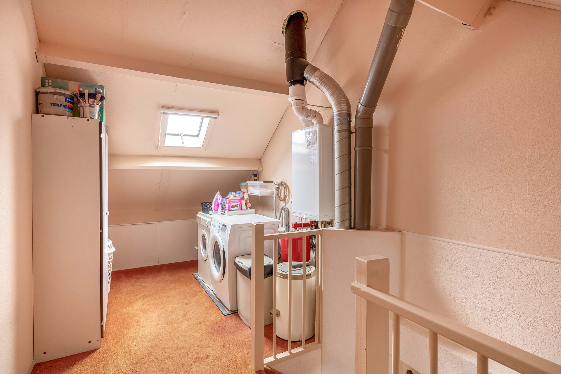 Op de voorzolder bevinden zich de wasmachine en droger en hier is tevens de lease-cv-ketel (Intergas, bouwjaar 2022) opgesteld. De gehele verdieping is voorzien van vloerbedekking.
