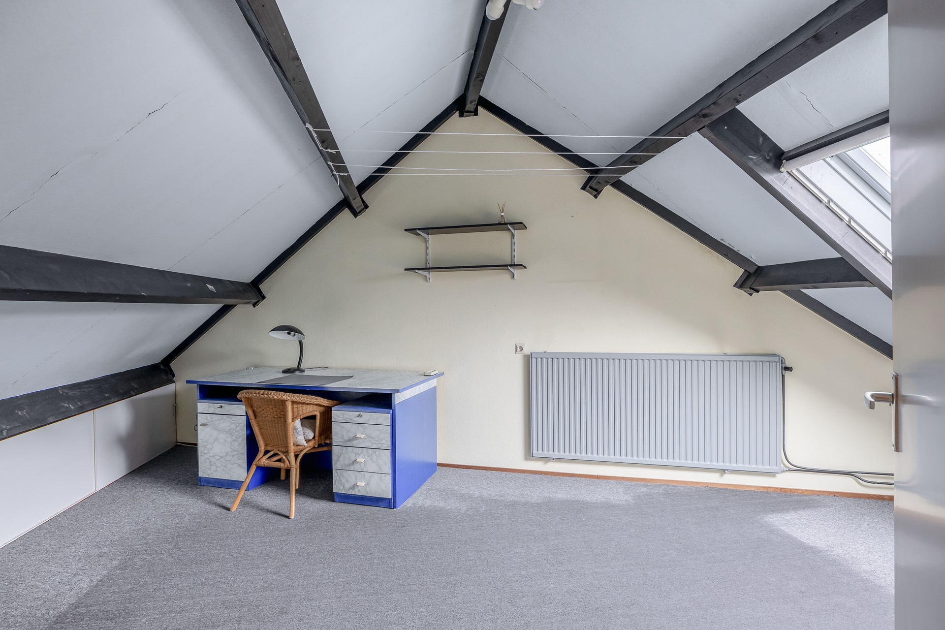 Deze verdieping was oorspronkelijk een open ruimte, maar wat een verrassing om hier nog een slaapkamer te vinden. Ruim, licht en ook prima geschikt als master bedroom. Er is een dakraam aanwezig en bergruimte achter de schotten.
