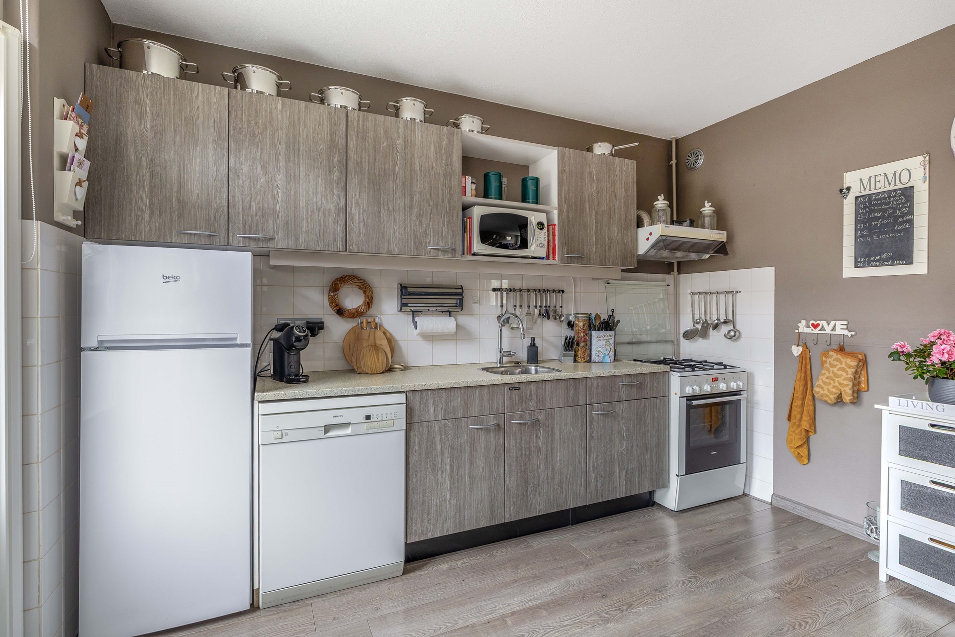 De open keuken is uitgevoerd in houtlook met een licht kunststof aanrechtblad en diverse apparatuur. De achterwand is gedeeltelijk betegeld met witte, vierkante tegels. De volgende apparatuur is aanwezig in de keuken: een vaatwasser, magnetron, koel-vriescombinatie, gaskookplaat met oven en daarboven een afzuigkap. Vanuit de keuken is er toegang tot de achtertuin.